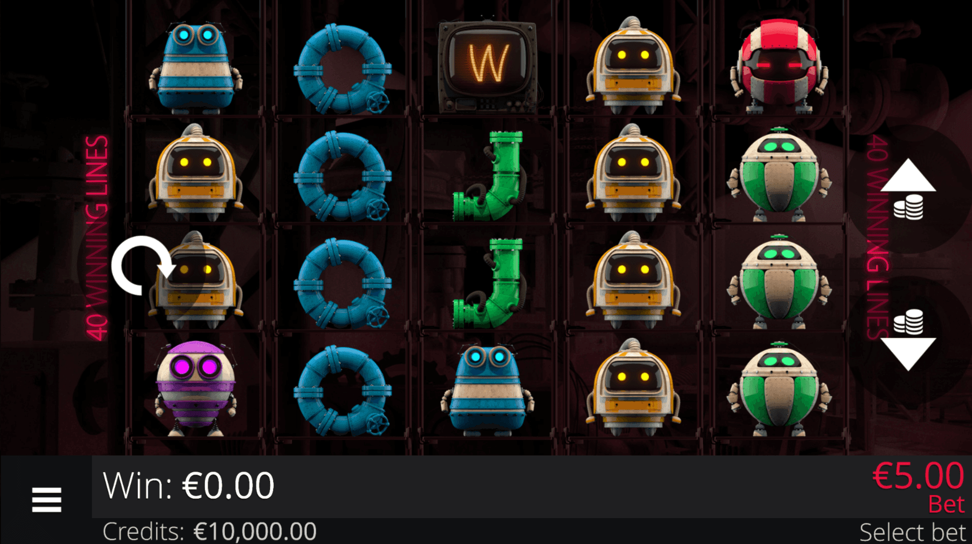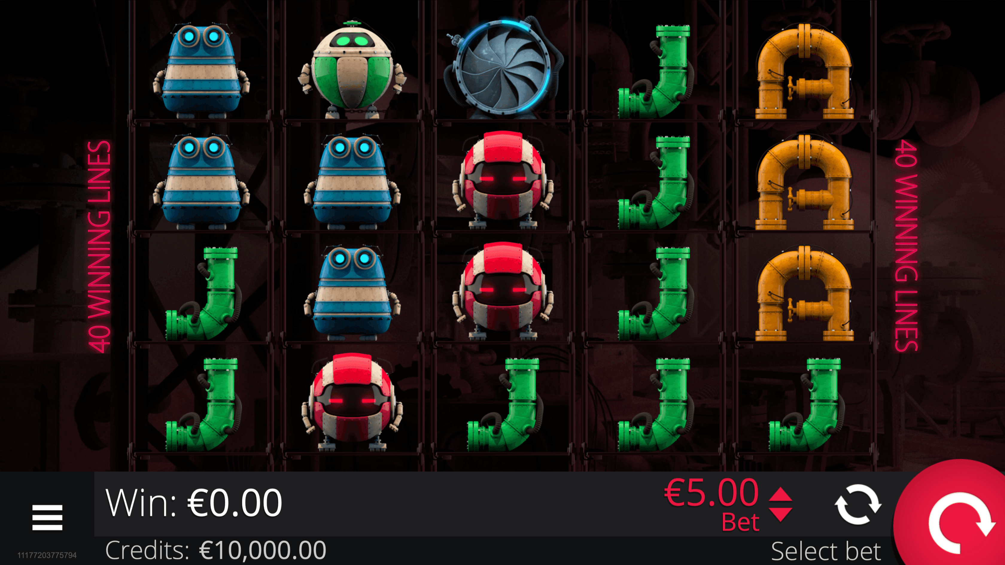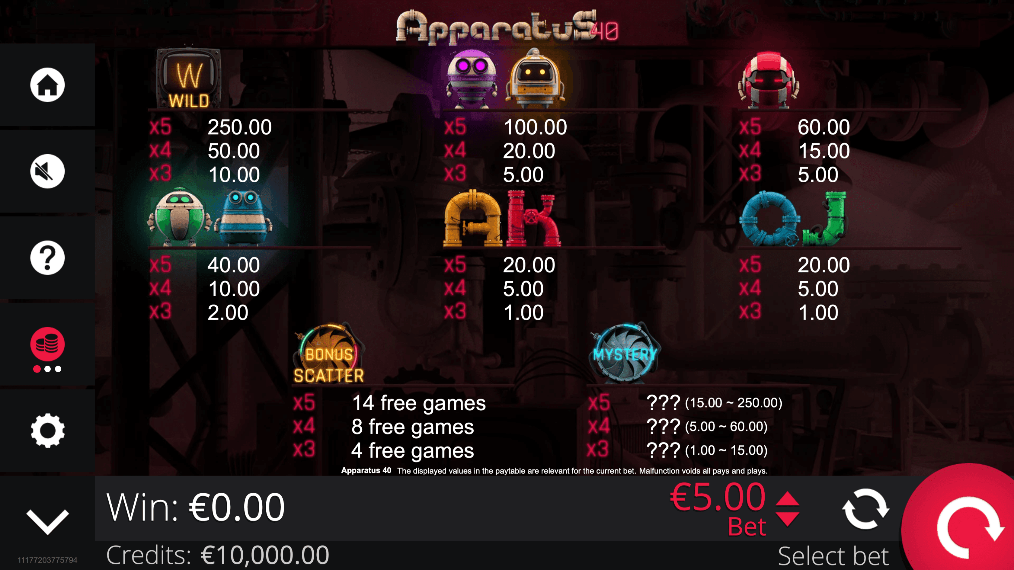 **APPARATUS 40** is a 5-reel, 5-row slot with 40 fixed paylines featuring robot symbols and three key mechanics. The **Wild Symbol** substitutes for all except the **Bonus Scatter**, and it can form its own wins when it doesn’t replace a stronger combination.