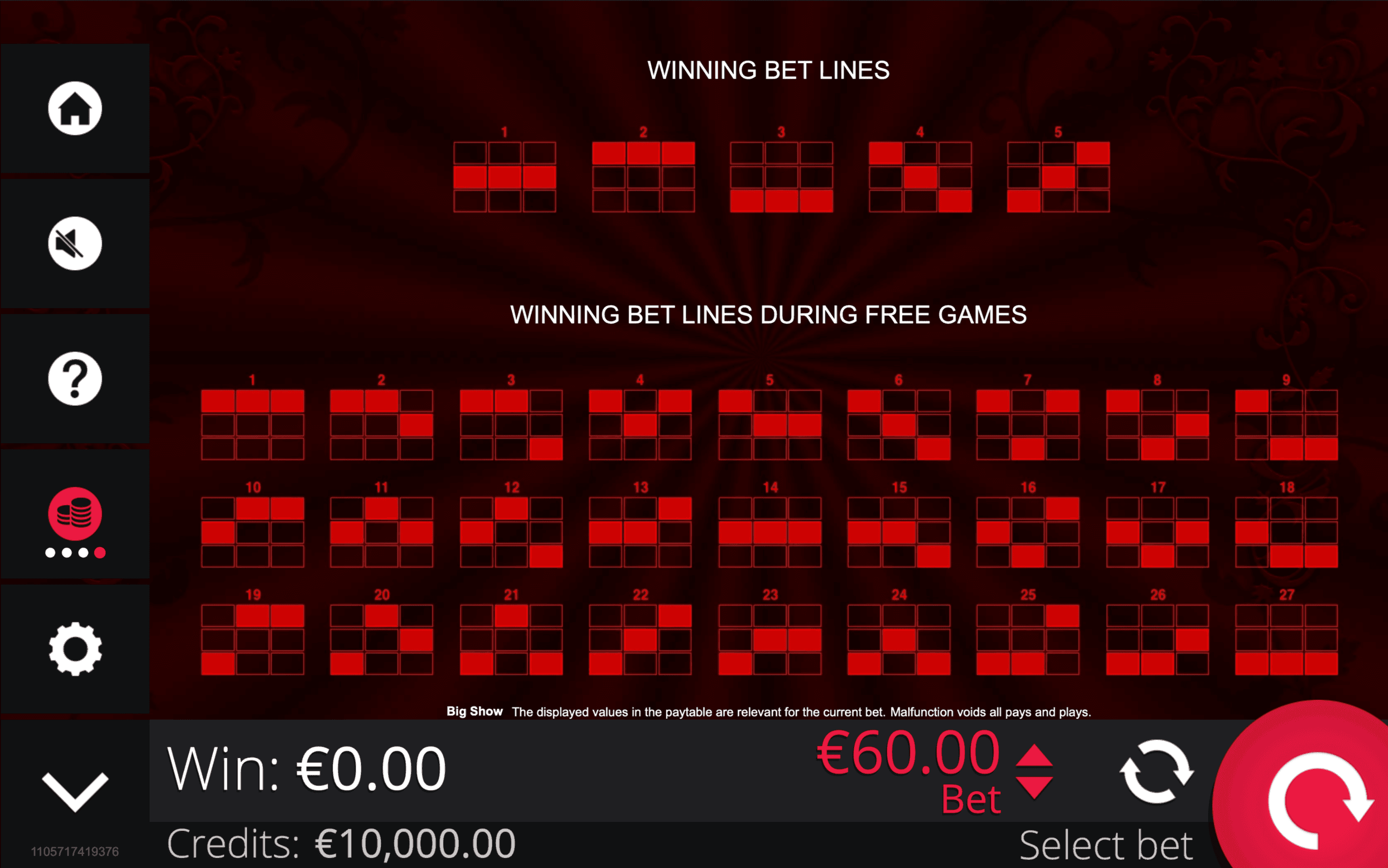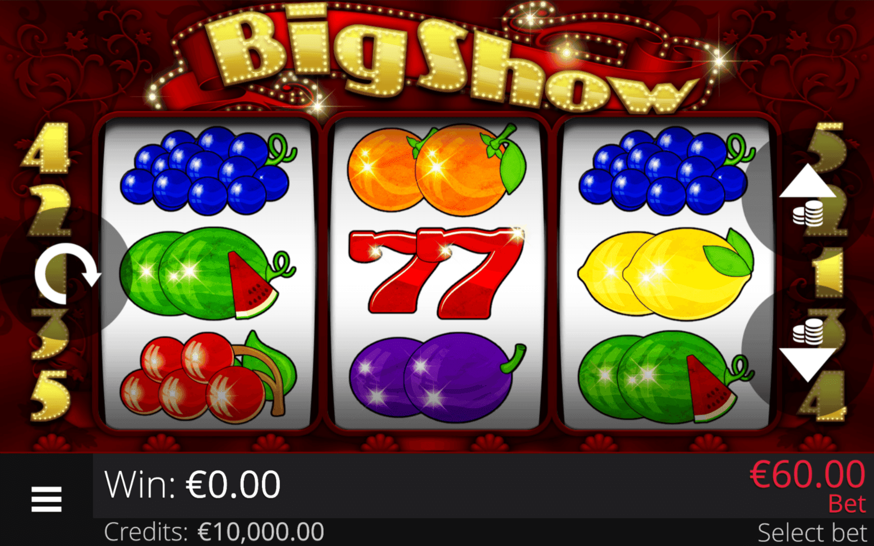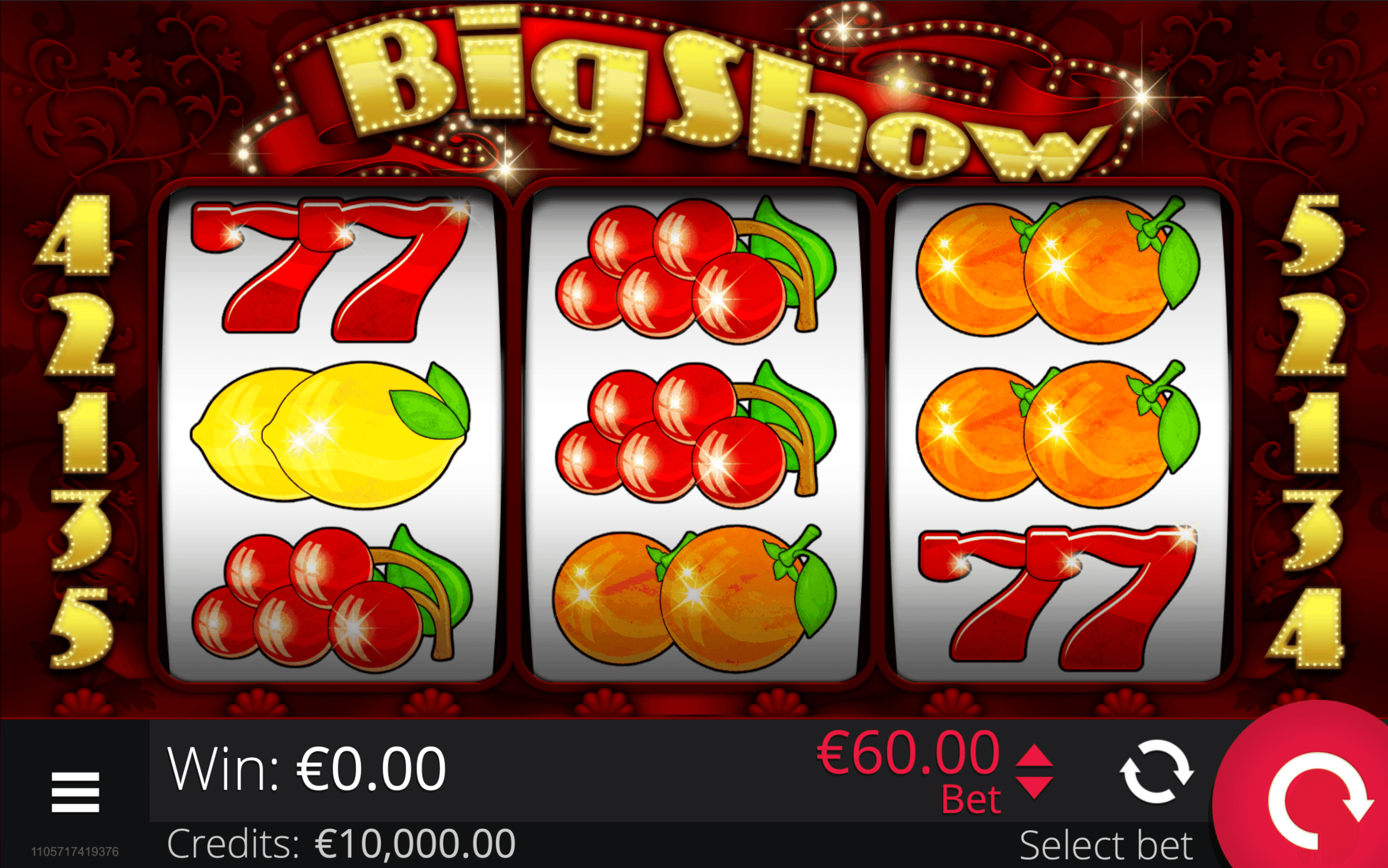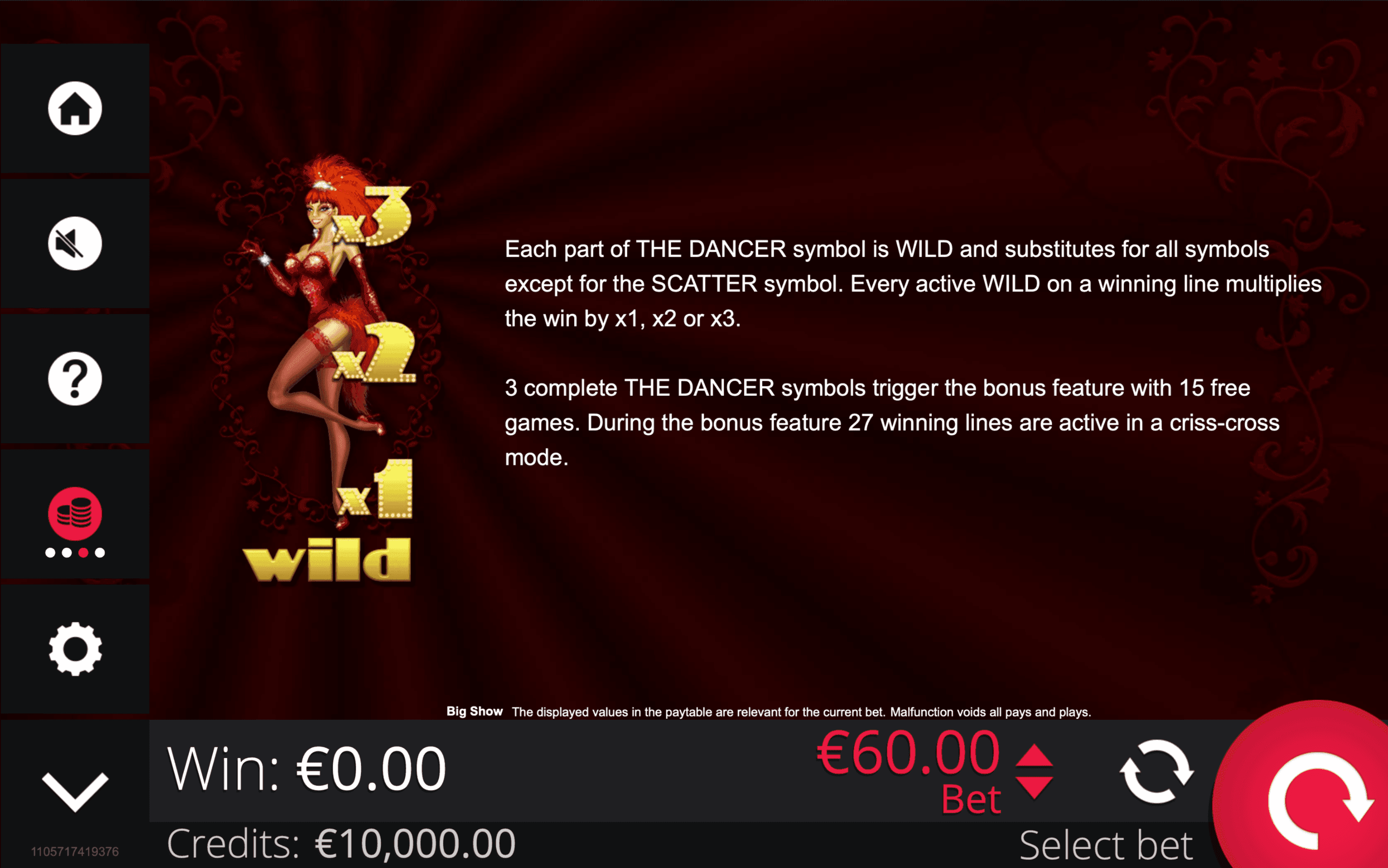 The **BIG SHOW** slot combines classic 3×3 reels with glamorous cabaret flair and** 5 fixed paylines**. The Dancer Wild appears in three parts, each substituting symbols and applying its own Multiplier — **3× (top), 2× (middle), 1× (bottom)**. With one Wild, wins can reach a **3×** Multiplier, with two Wilds up to **9×**.