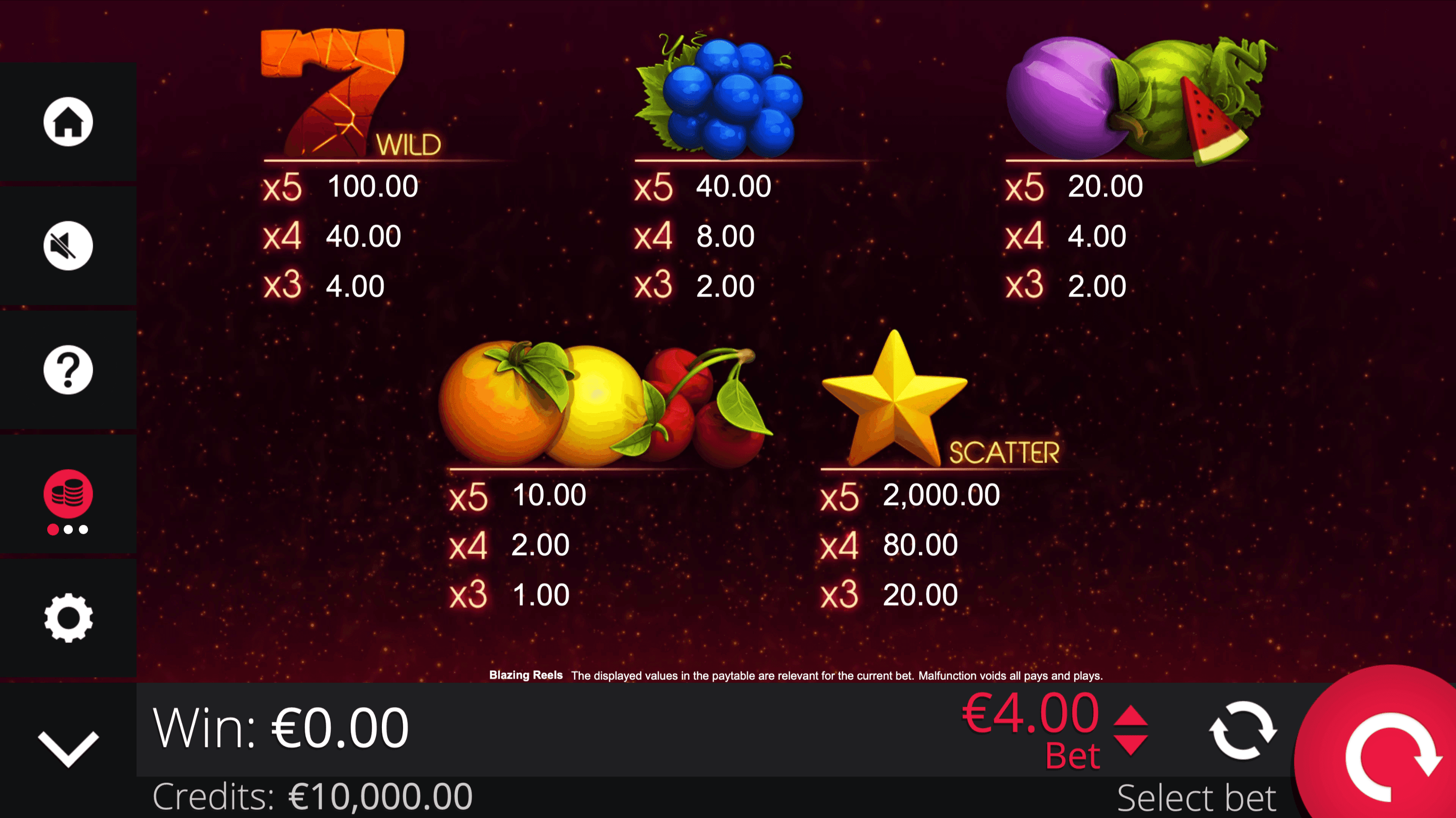 **BLAZING REELS** sets 5 reels and 40 paylines ablaze with melons, grapes, cherries, and sevens that act as Wilds to complete winning combinations.