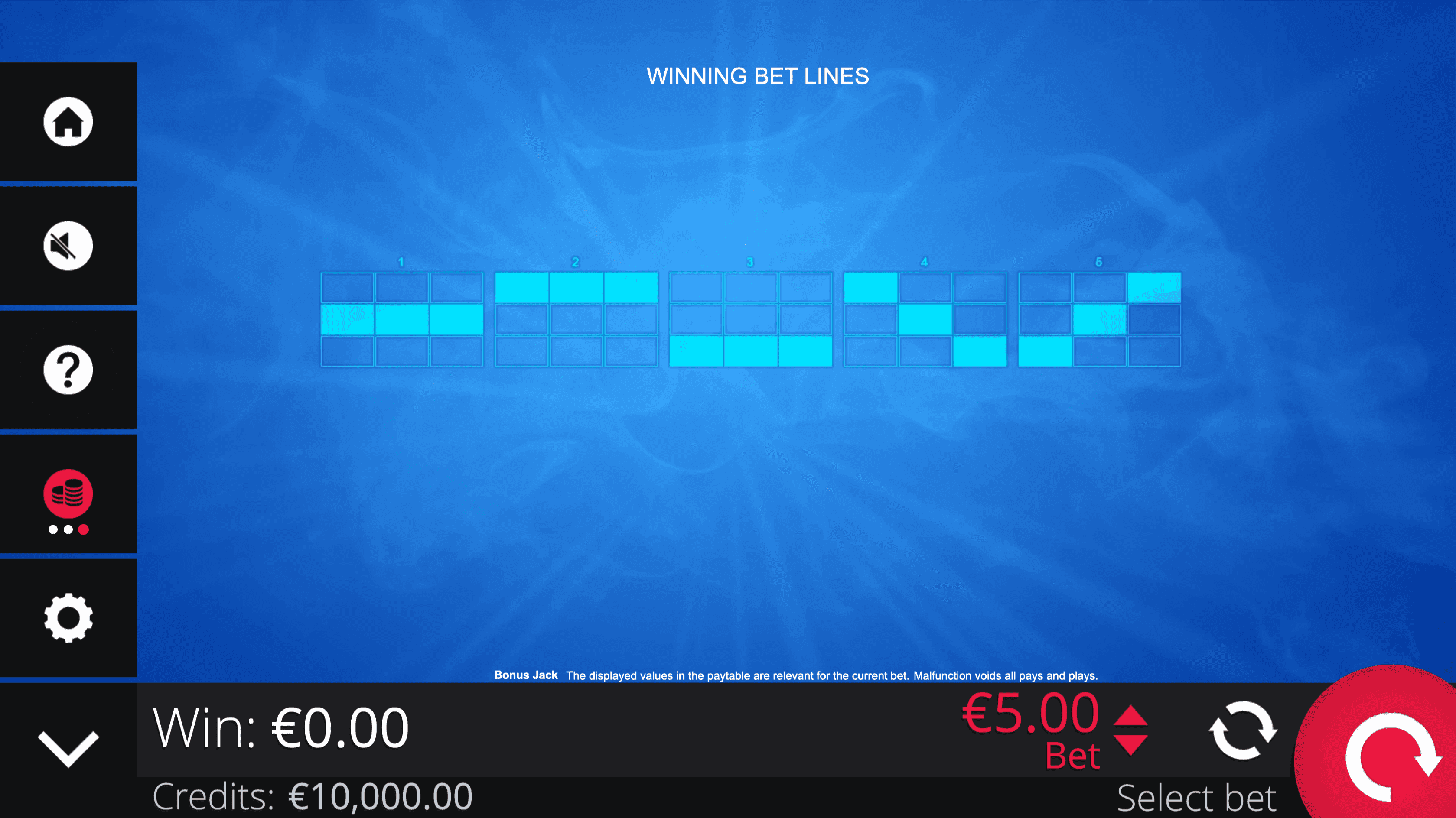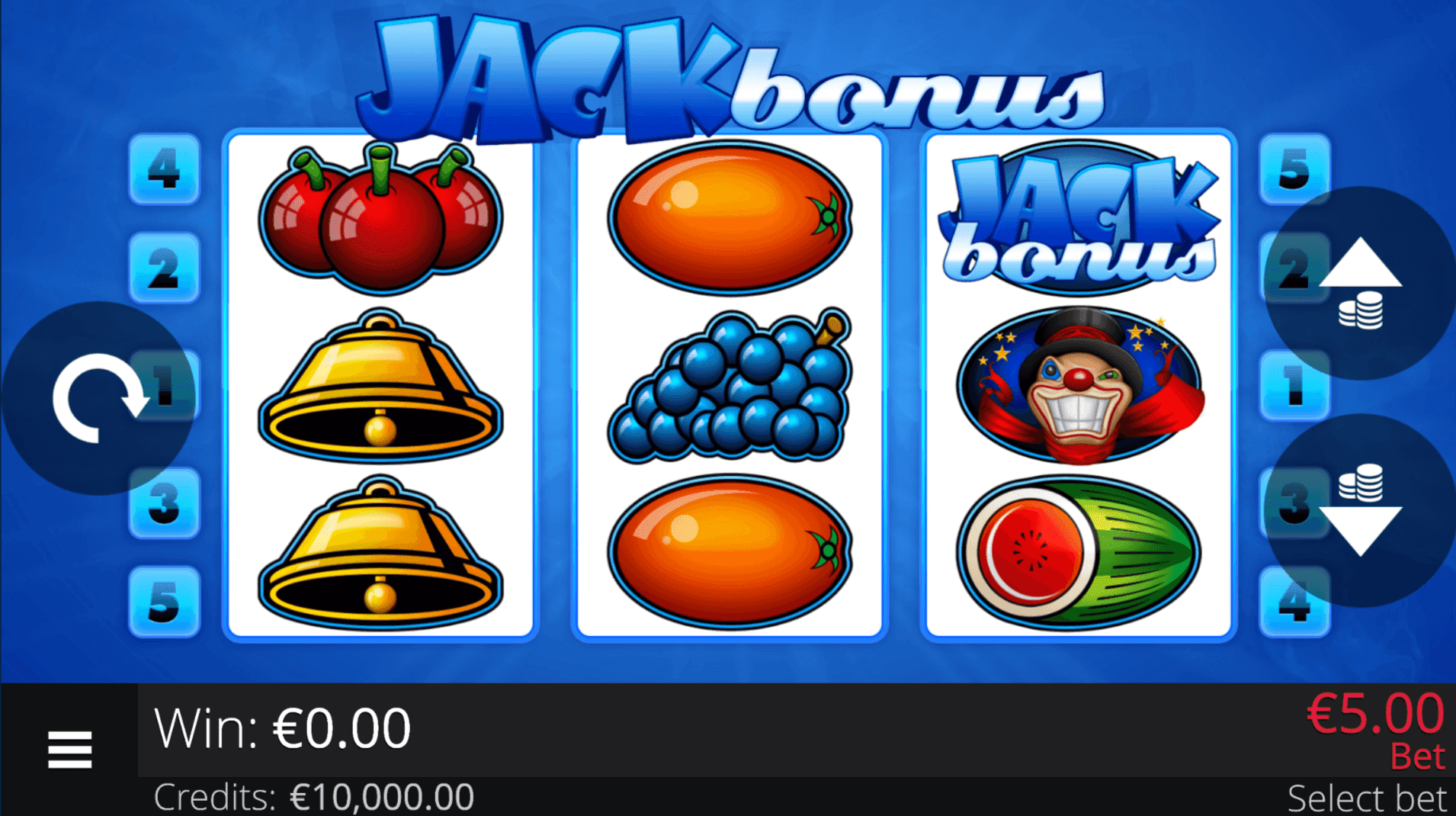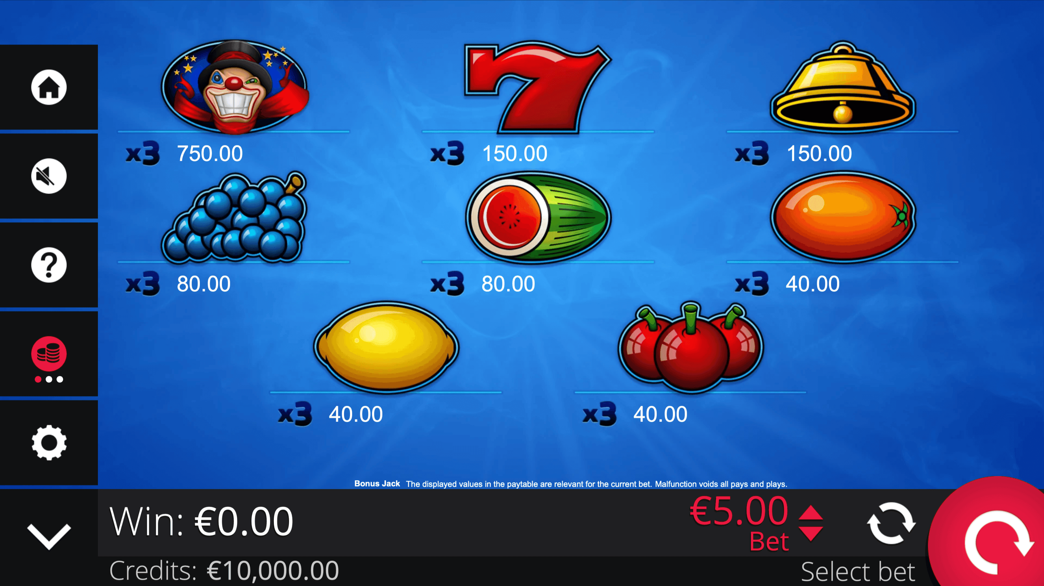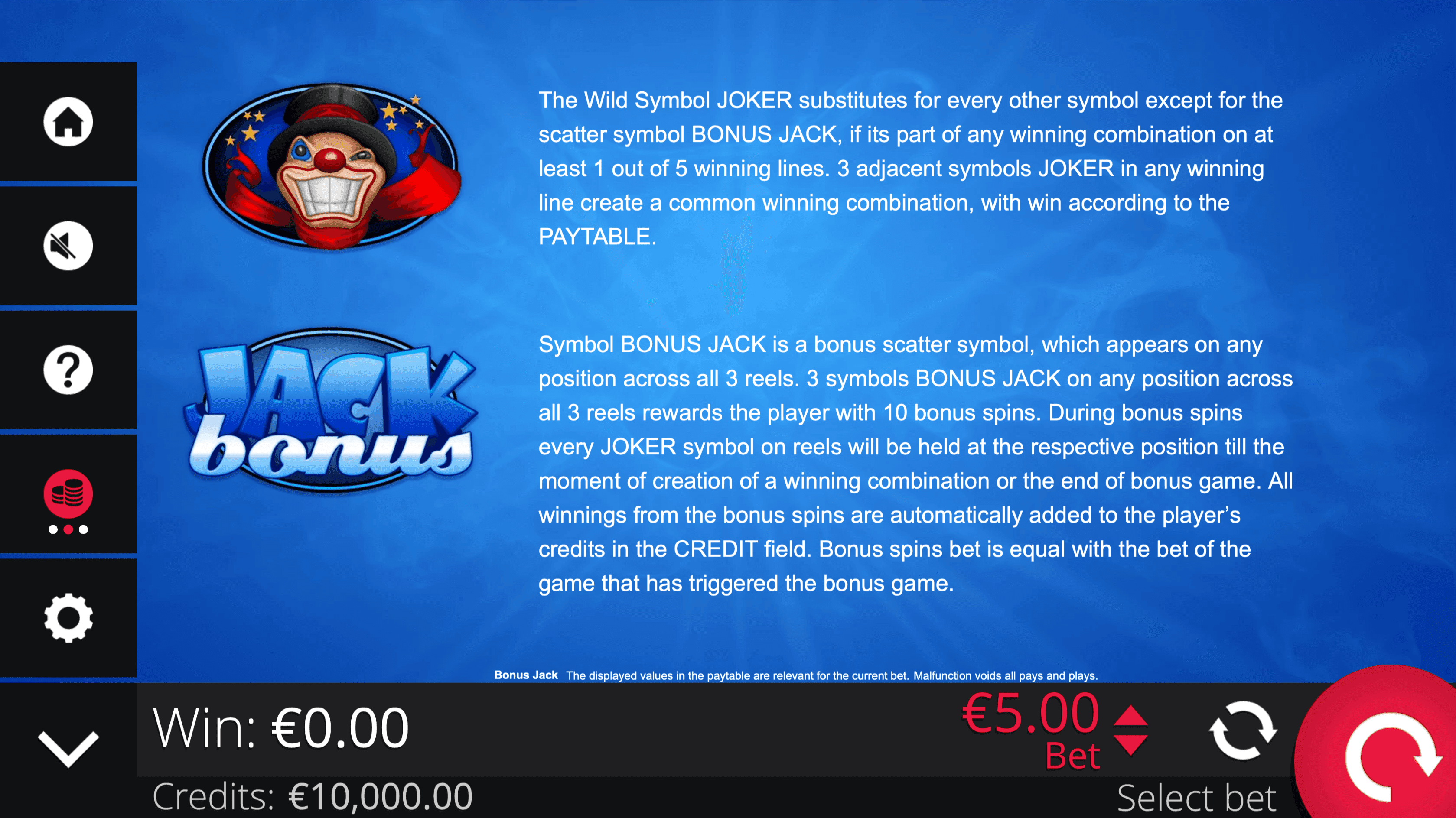 **BONUS JACK** is a 3-reel, 3-row slot with 5 fixed paylines. The **Joker Wild Symbol** substitutes for regular symbols on any winning line and forms its own combinations when 3 Jokers land adjacently.