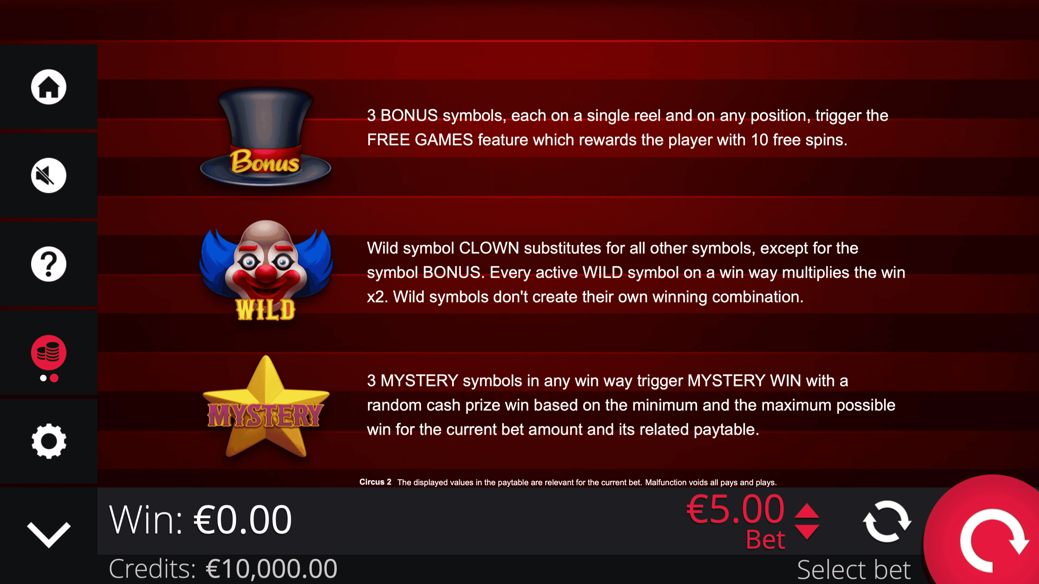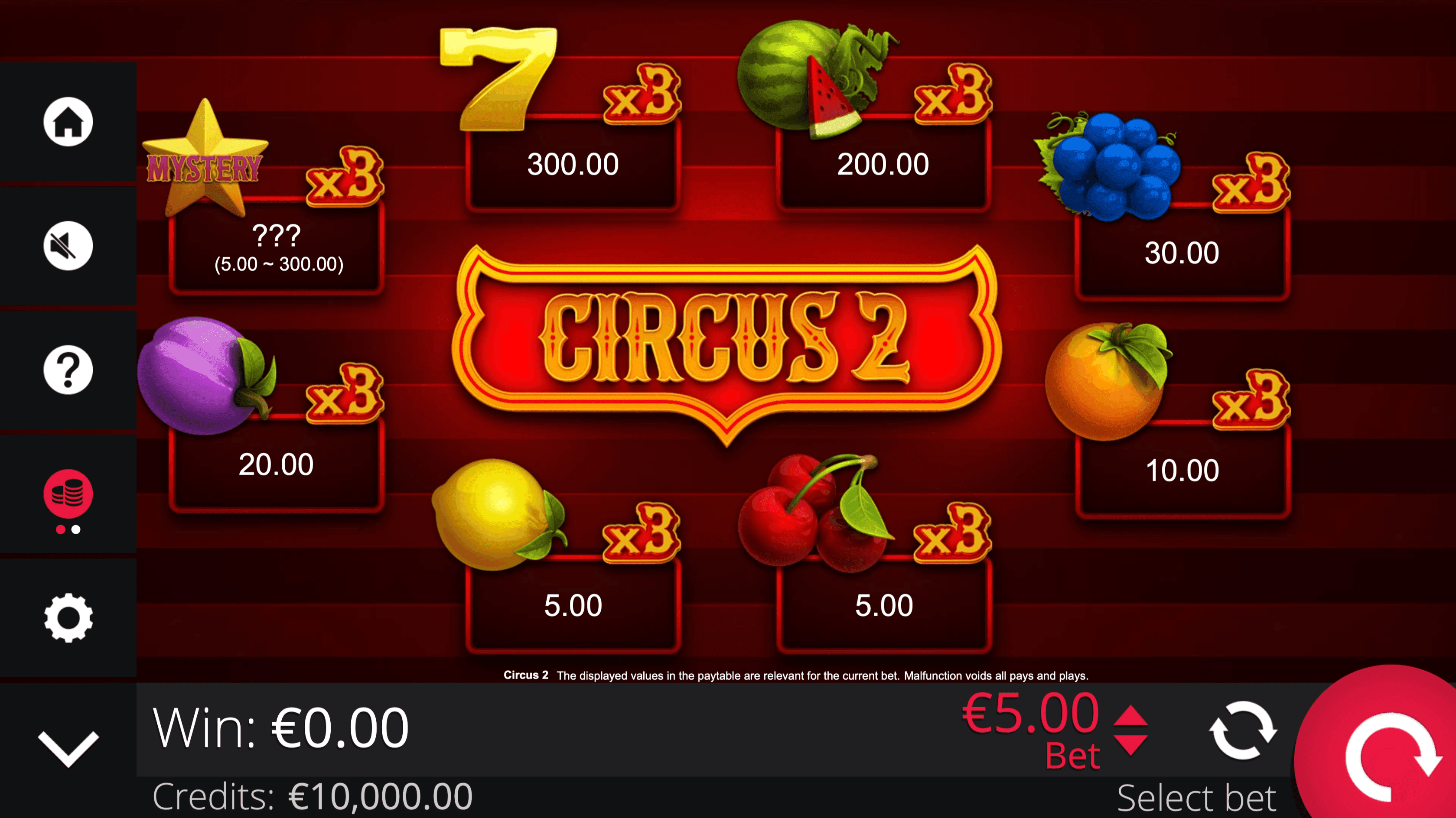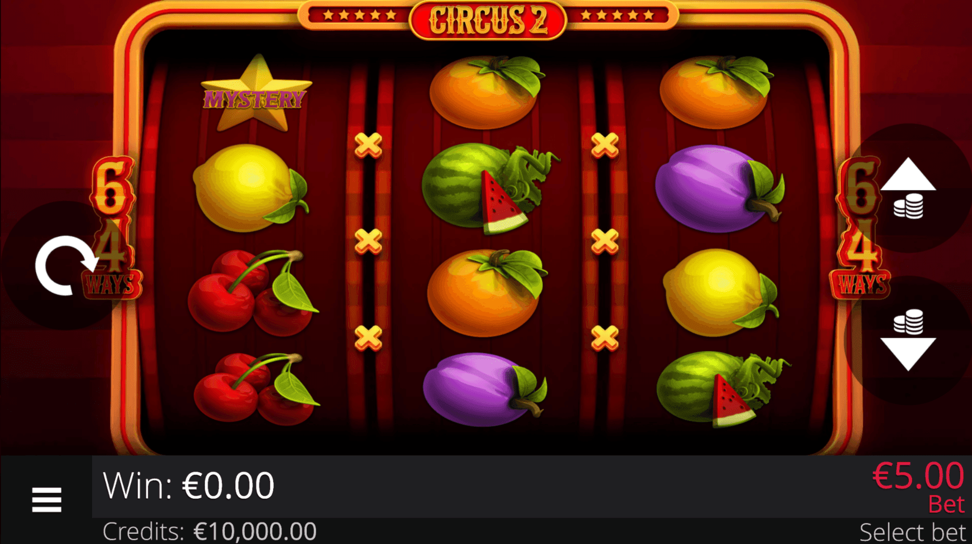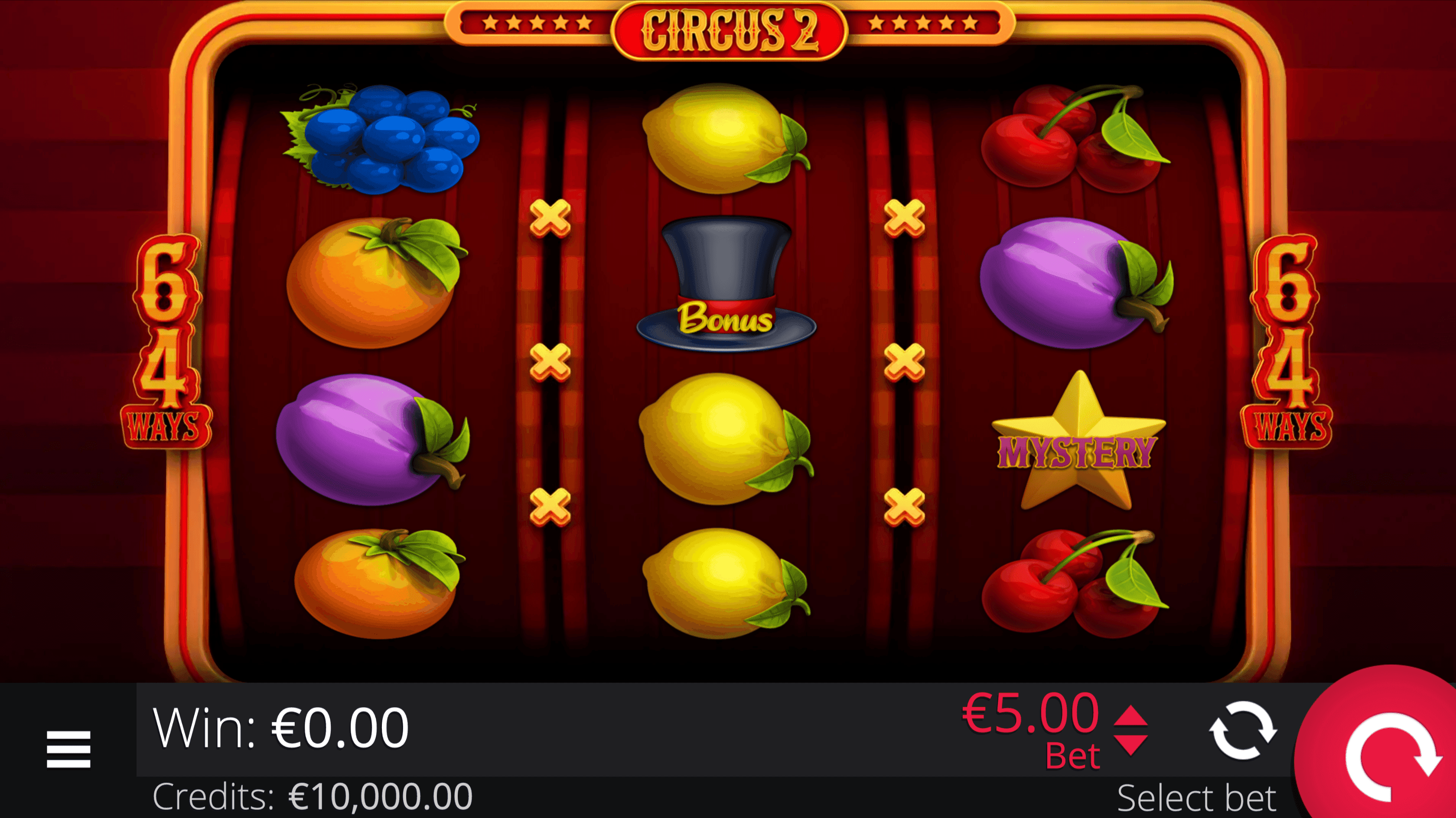 **CIRCUS 2** is a 3-reel, 4-row slot with 64 paylines. Spin classic fruit symbols including lucky seven, melon, grapes, plum, orange, lemon, and cherries. Clown Wild Symbol substitute for other symbols and **double any win** they are part of.