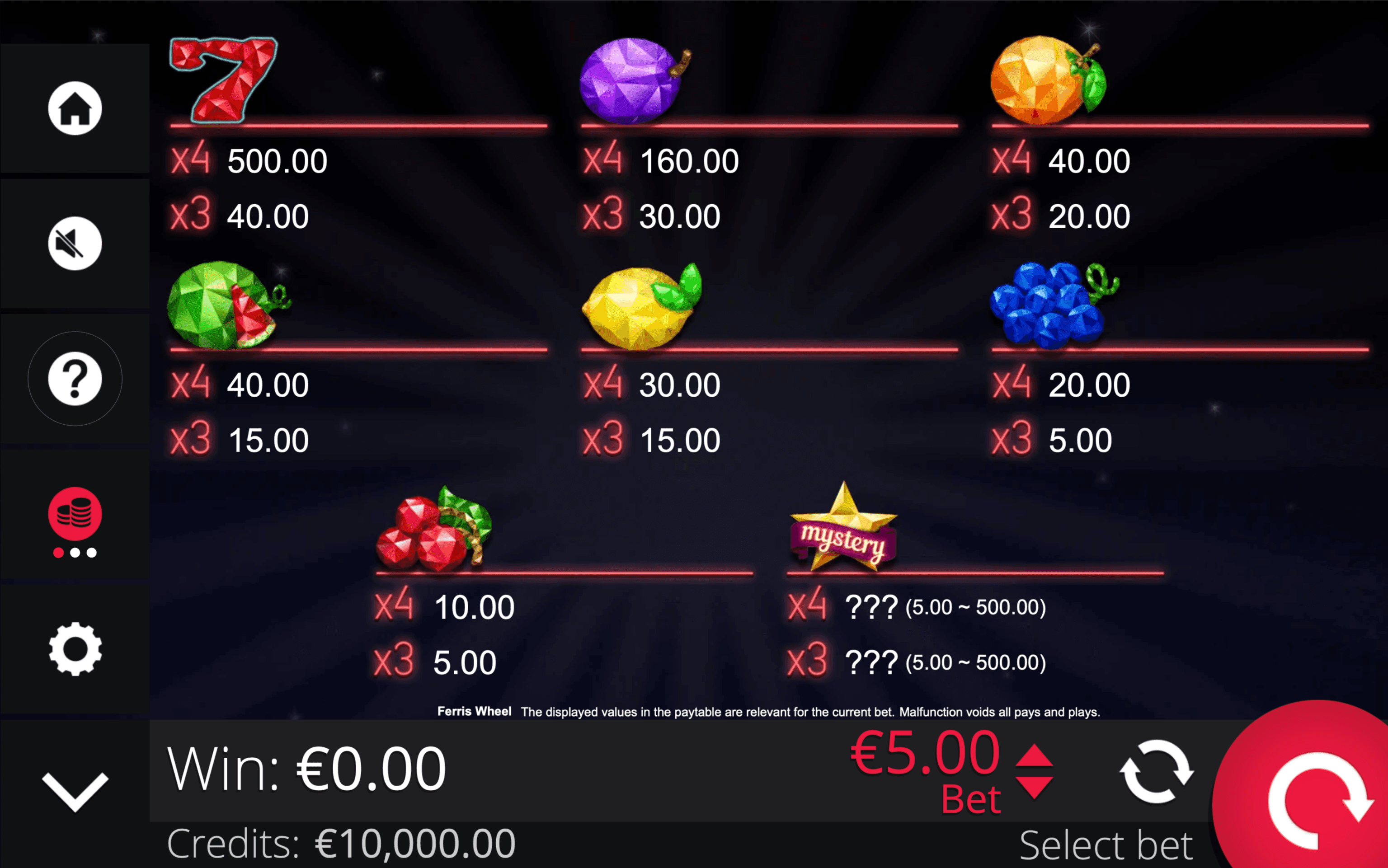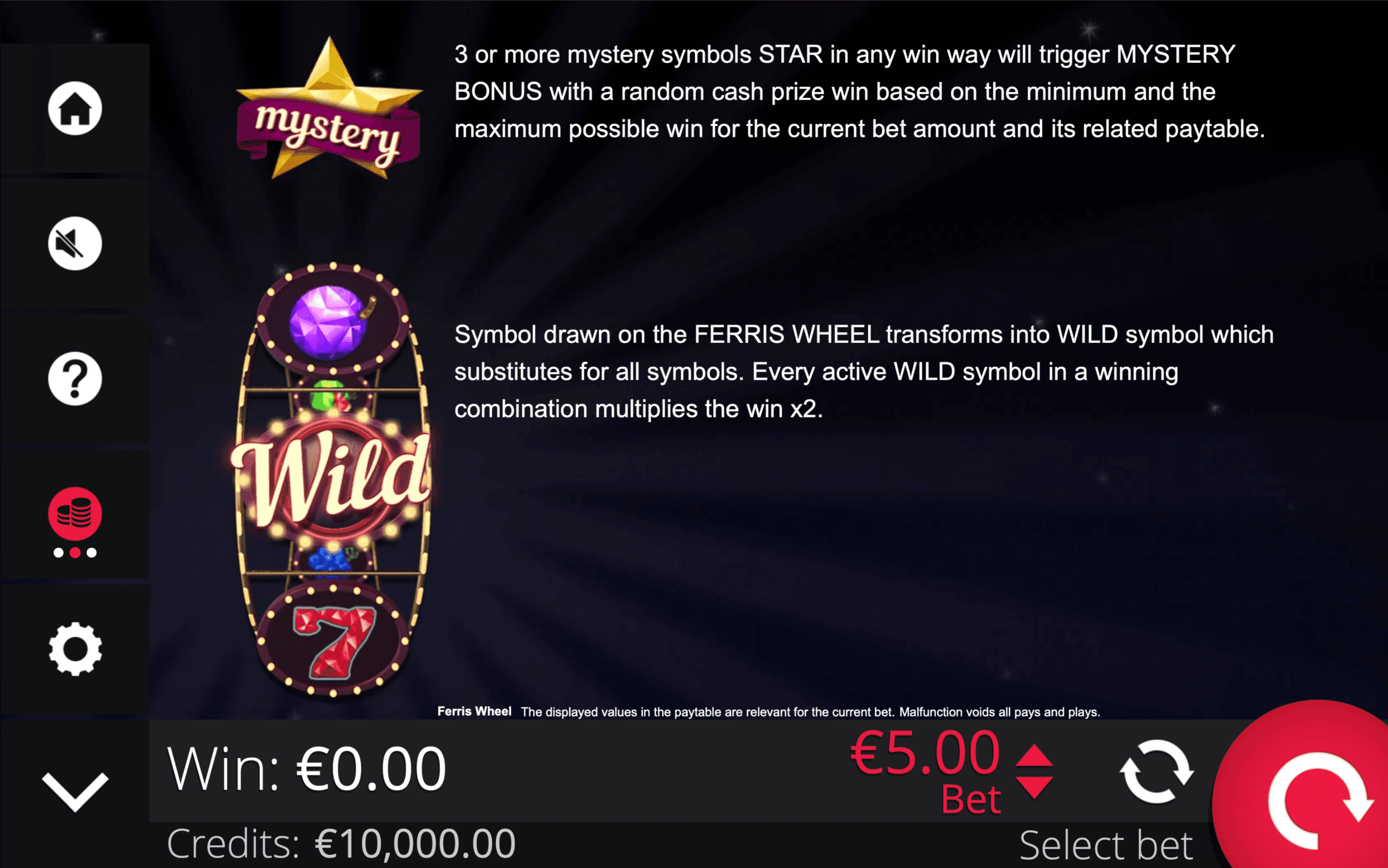 **FERRIS WHEEL** plays on 4 reels and 4 rows with 256 paylines. After each spin, the Bonus Ferris Wheel randomly selects a symbol to become Wild on all reels, replacing symbols to form winning combinations. Each Wild in a winning line **doubles the payout** (2× Multiplier).