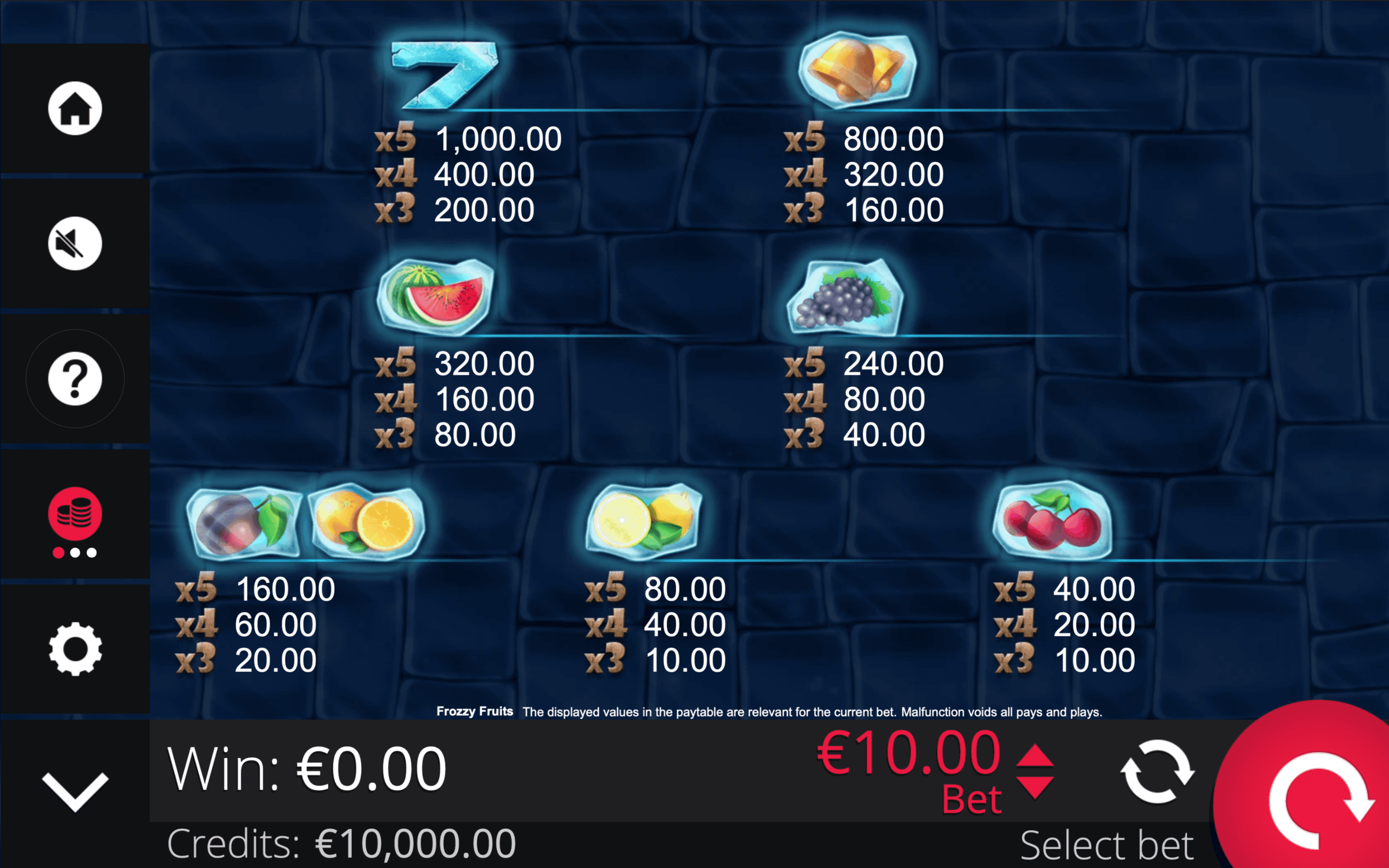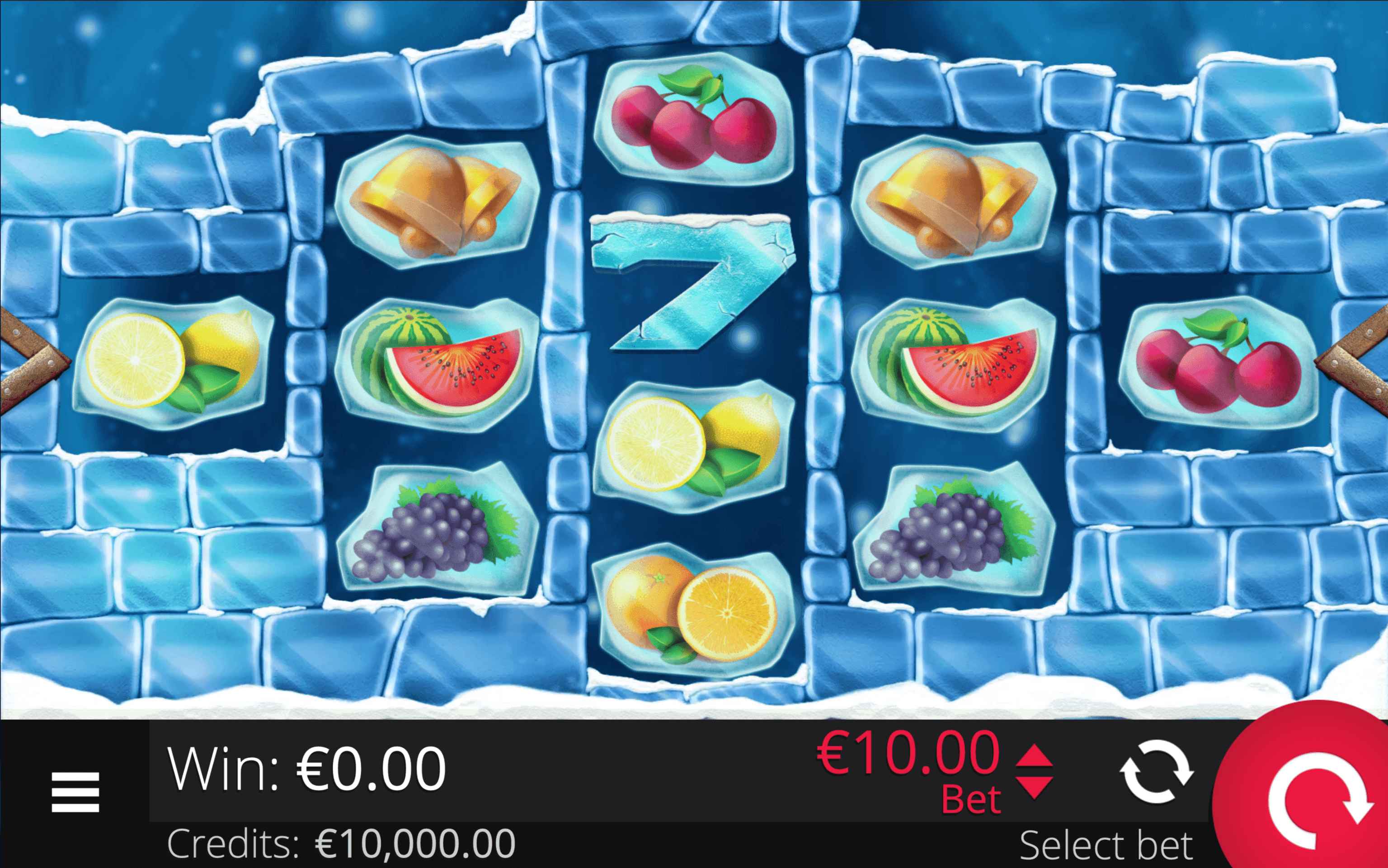 Colorful frozen fruits, bells, and lucky sevens create winning combos across the reels. All wins are calculated according to the active paylines and stake, and displayed in the in-game paytable.
