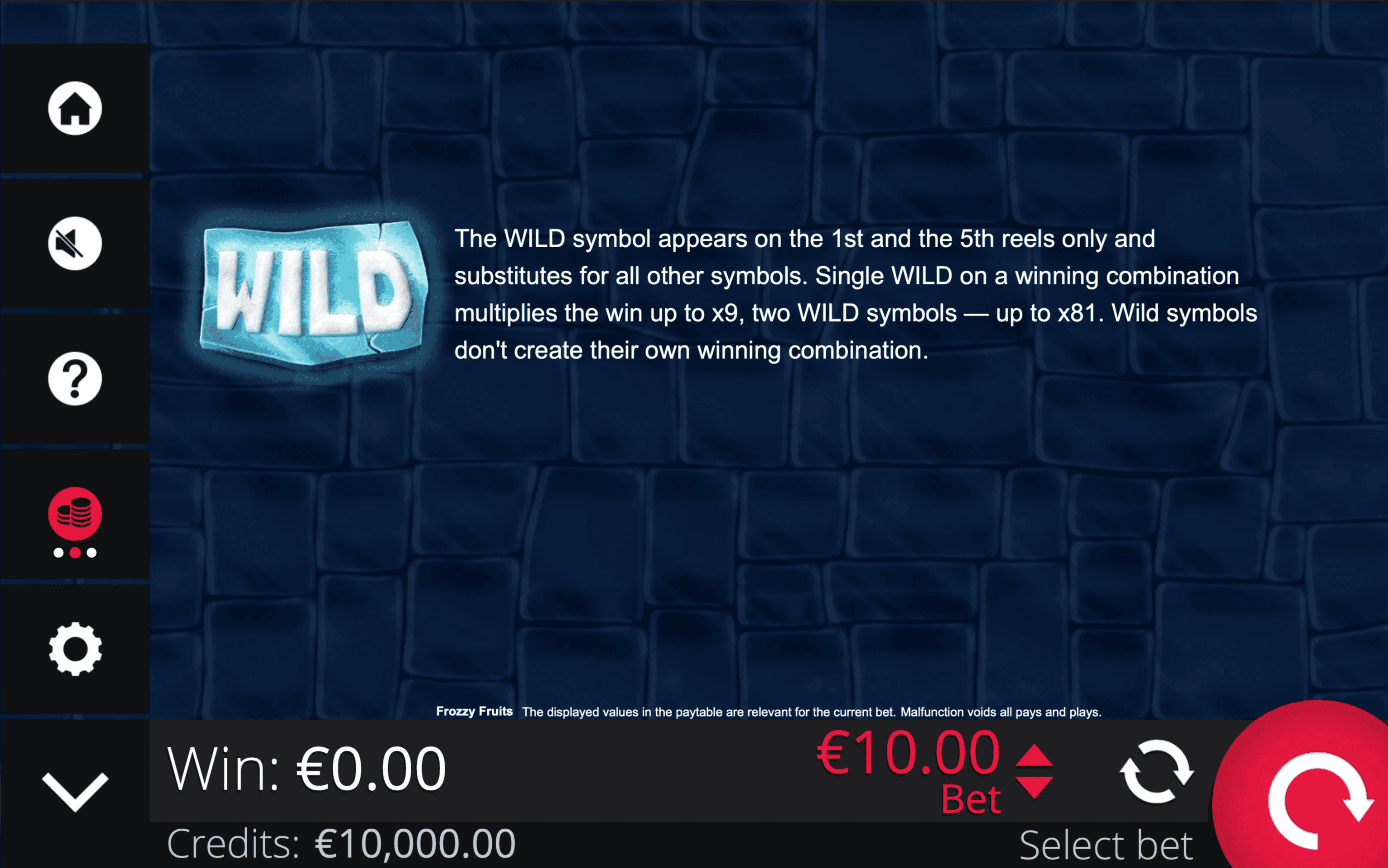 **FROZZY FRUITS** is a 5-reel slot with 36 paylines featuring **Wild Symbols** on the first and fifth reels. Each Wild multiplies any winning combination it contributes to by **1× up to 9×**.