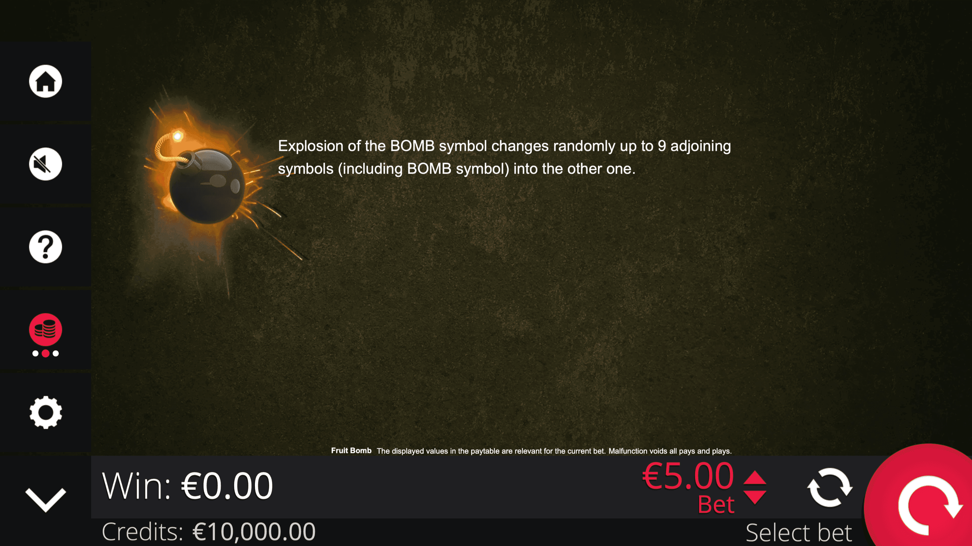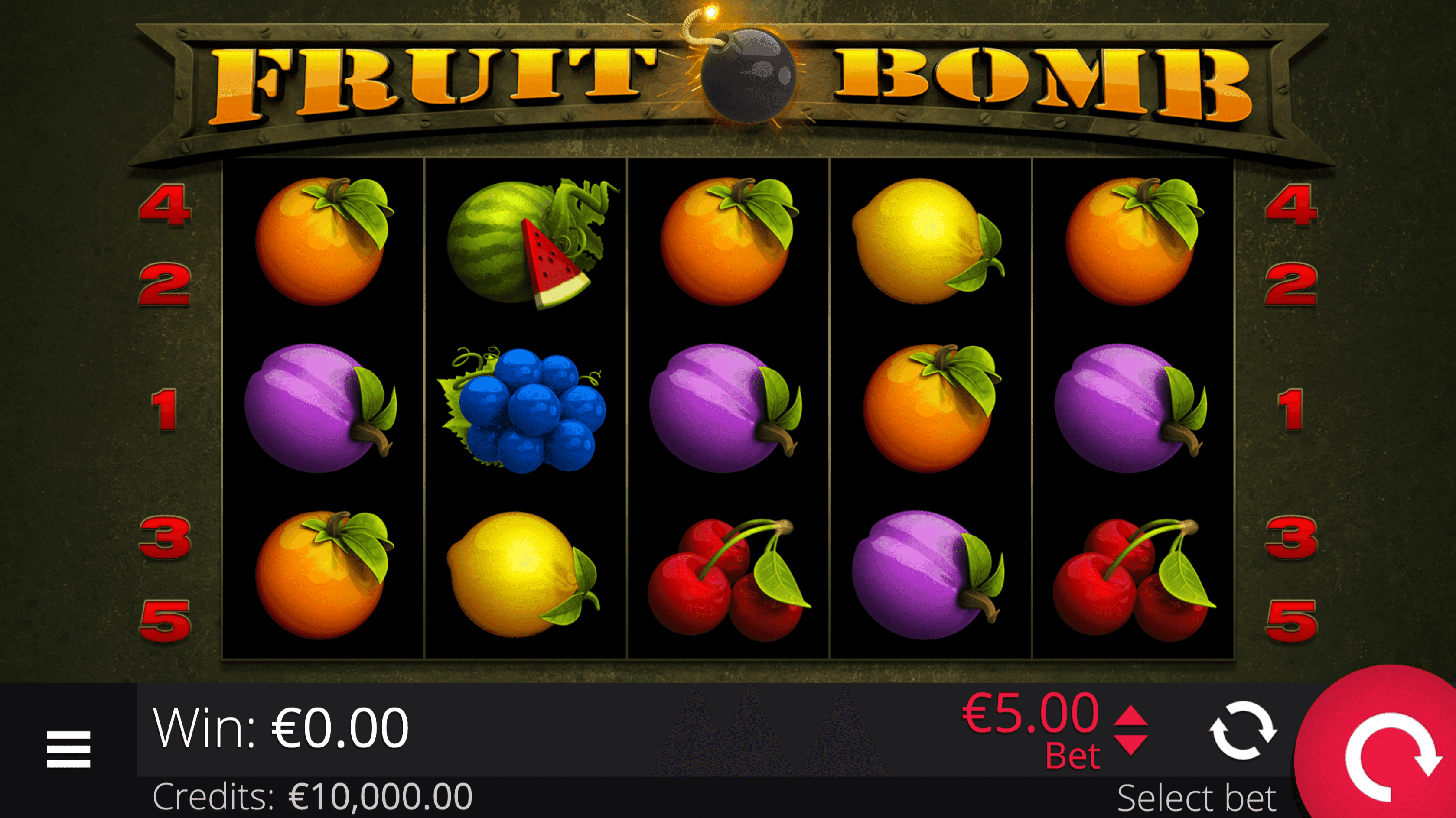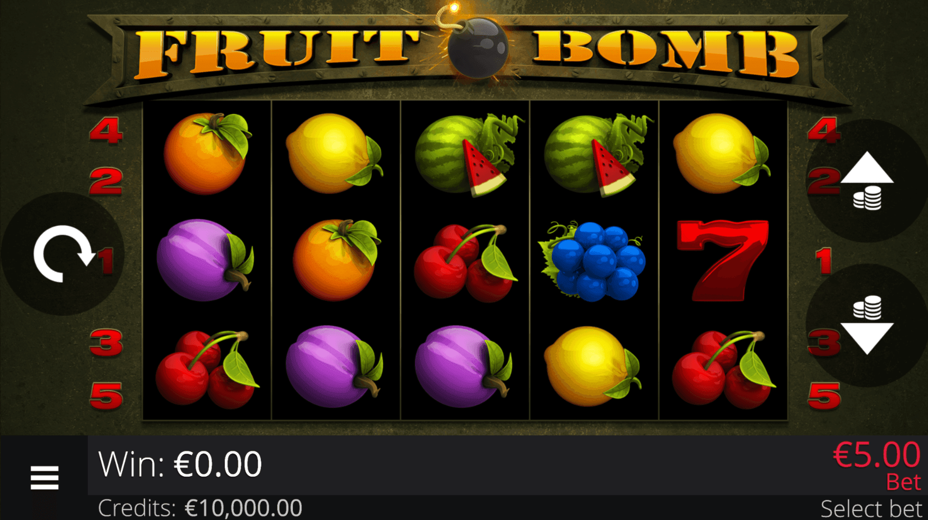 Explosive 5-reel fruit slot with 5 paylines, both-way wins and a Bomb Wild that transforms adjacent symbols for boosted payout potential.