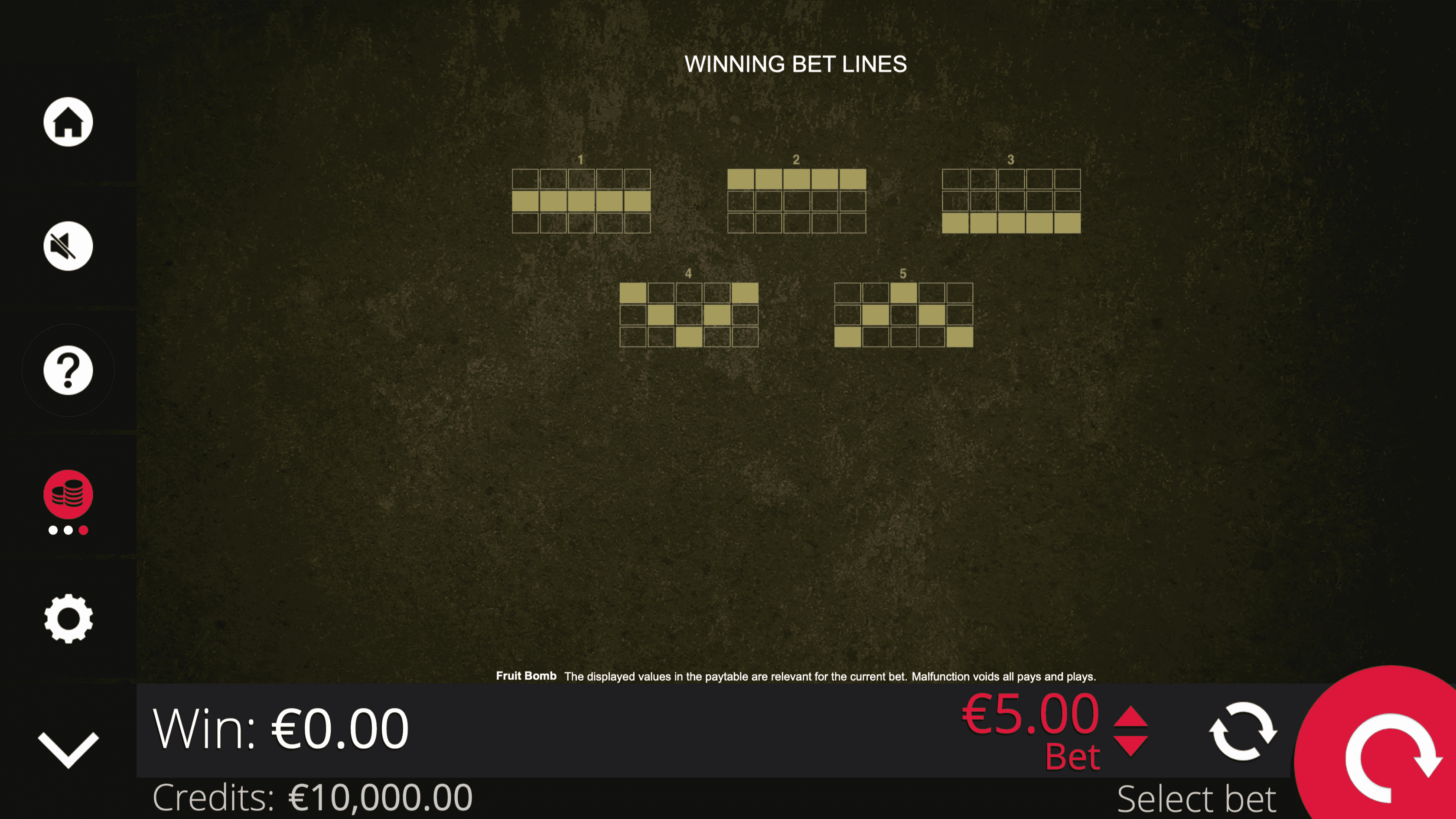 **FRUIT BOMB** is a **5-reel, 5-payline** fruit slot that pays **both ways** and even from the center, creating frequent line combinations from multiple directions. Classic fruit icons and Lucky Seven shape the core payout structure.