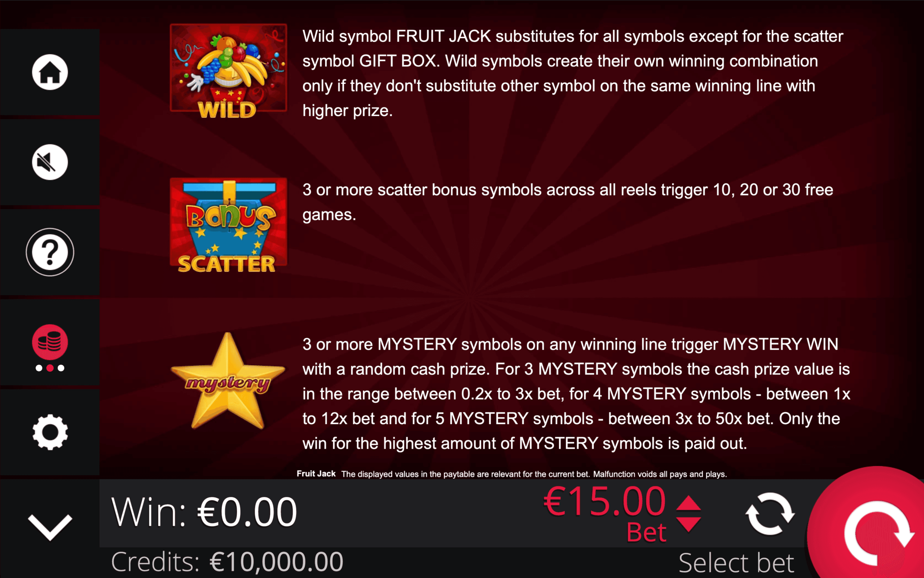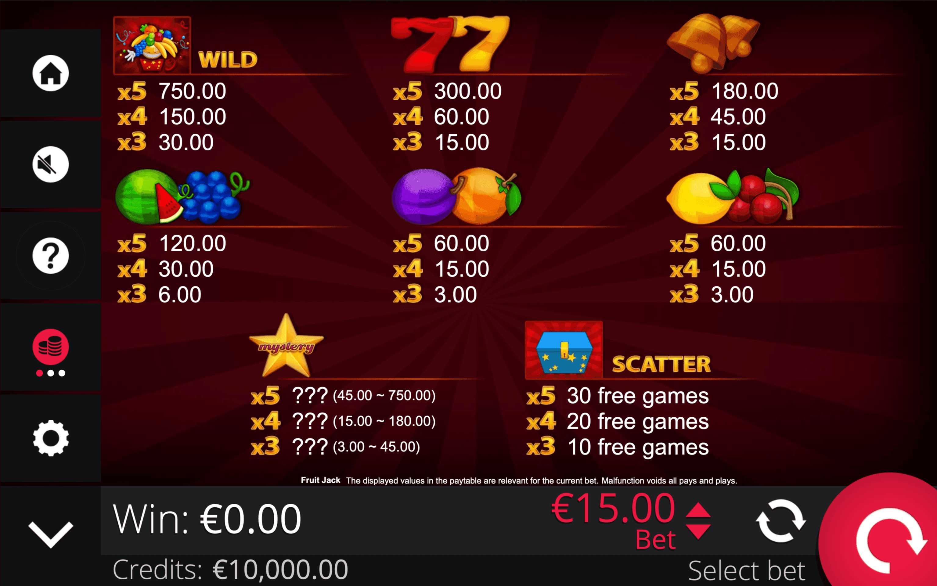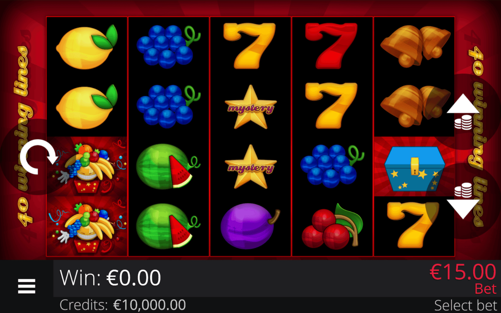 Classic fruit slot with 12 symbols including Wild, Scatter, and Mystery Symbols. Bonus Free Spins and Mystery Wins are triggered across 40 paylines.