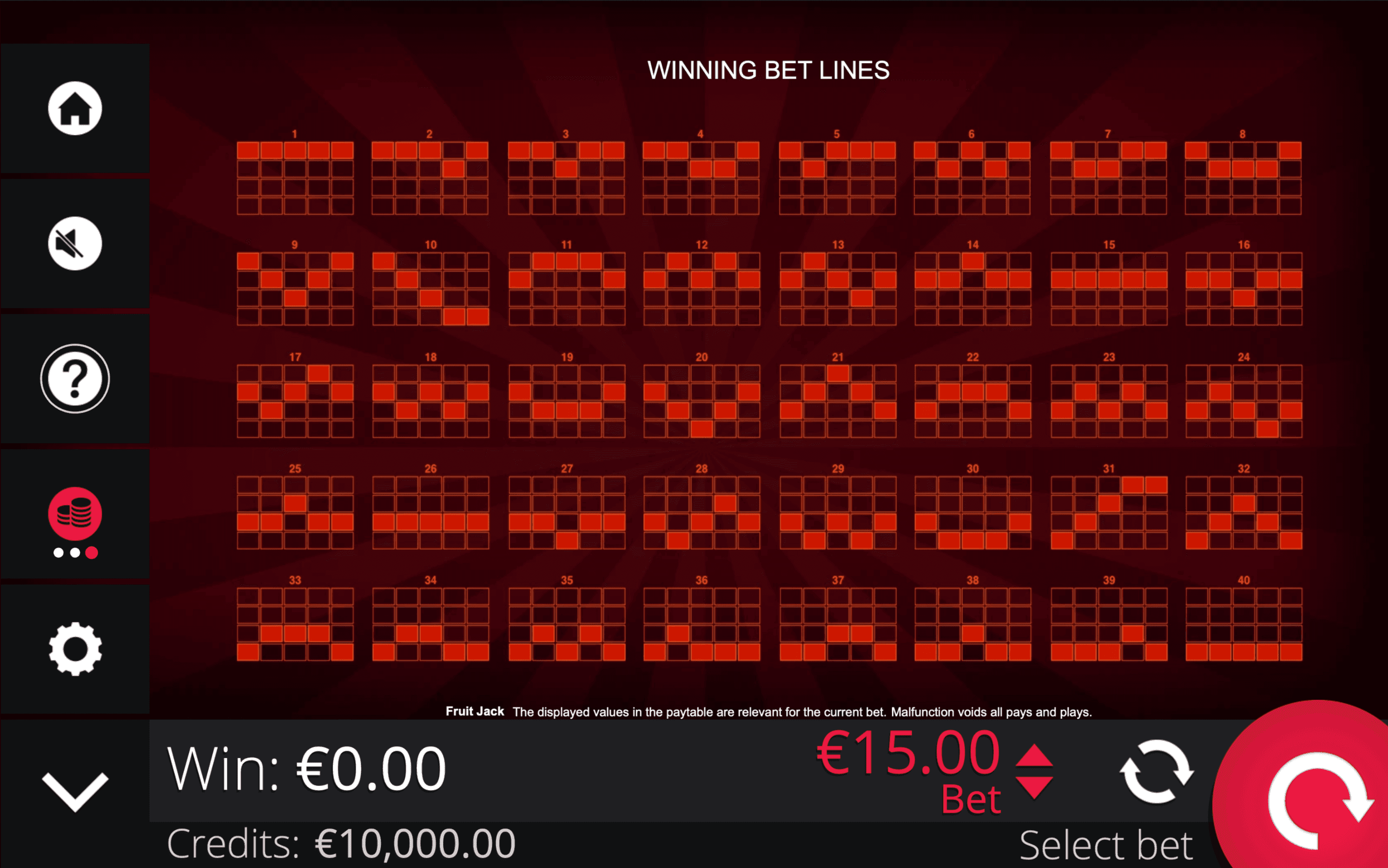 The **FRUIT JACK** slot features 12 symbols, including Wild symbol Fruit Jack that substitutes in winning lines. Wilds can also create their own combinations if not replacing higher-paying symbols.