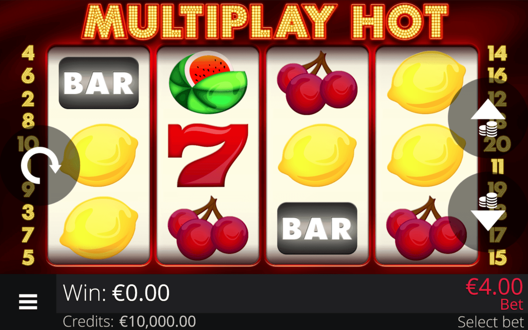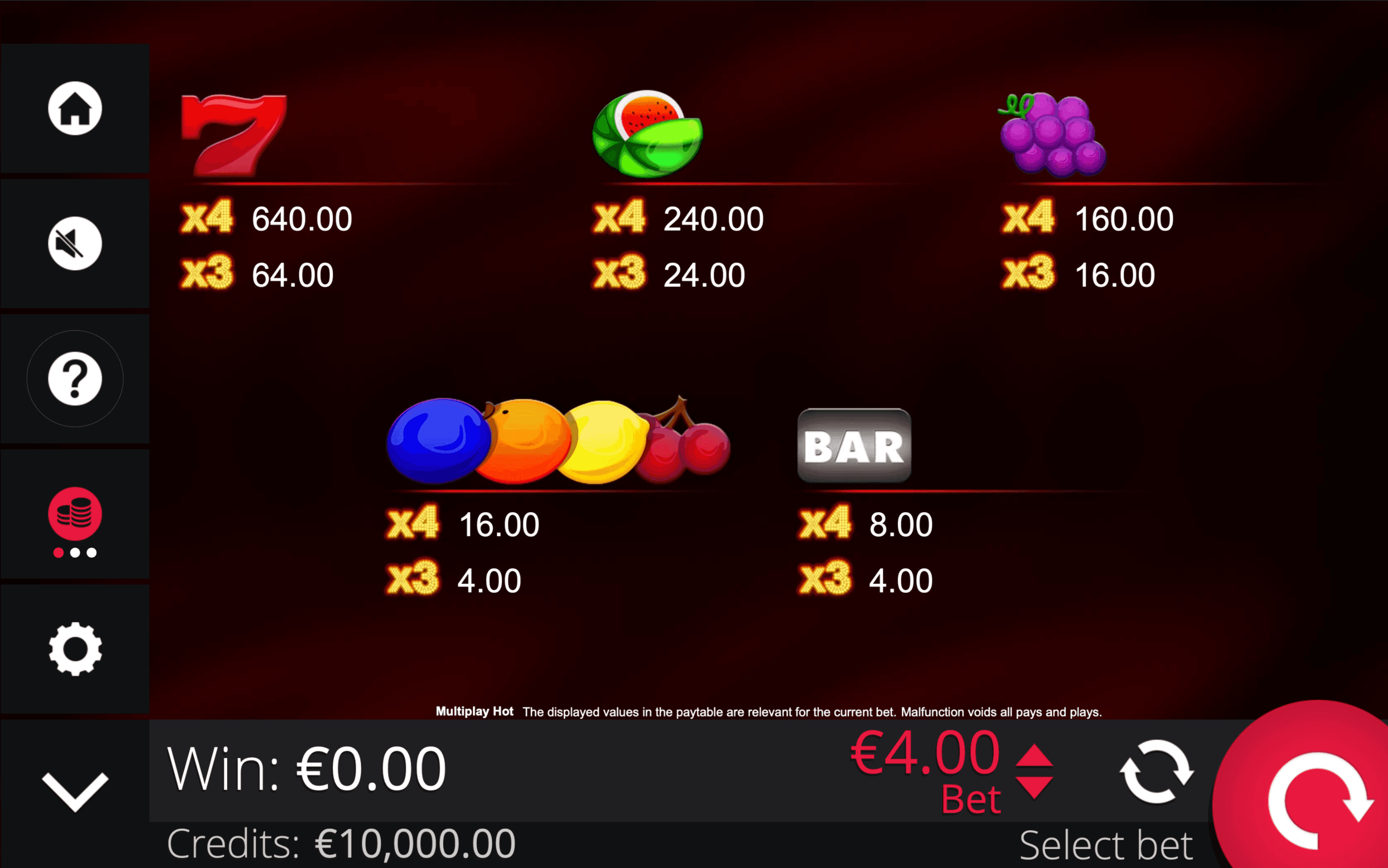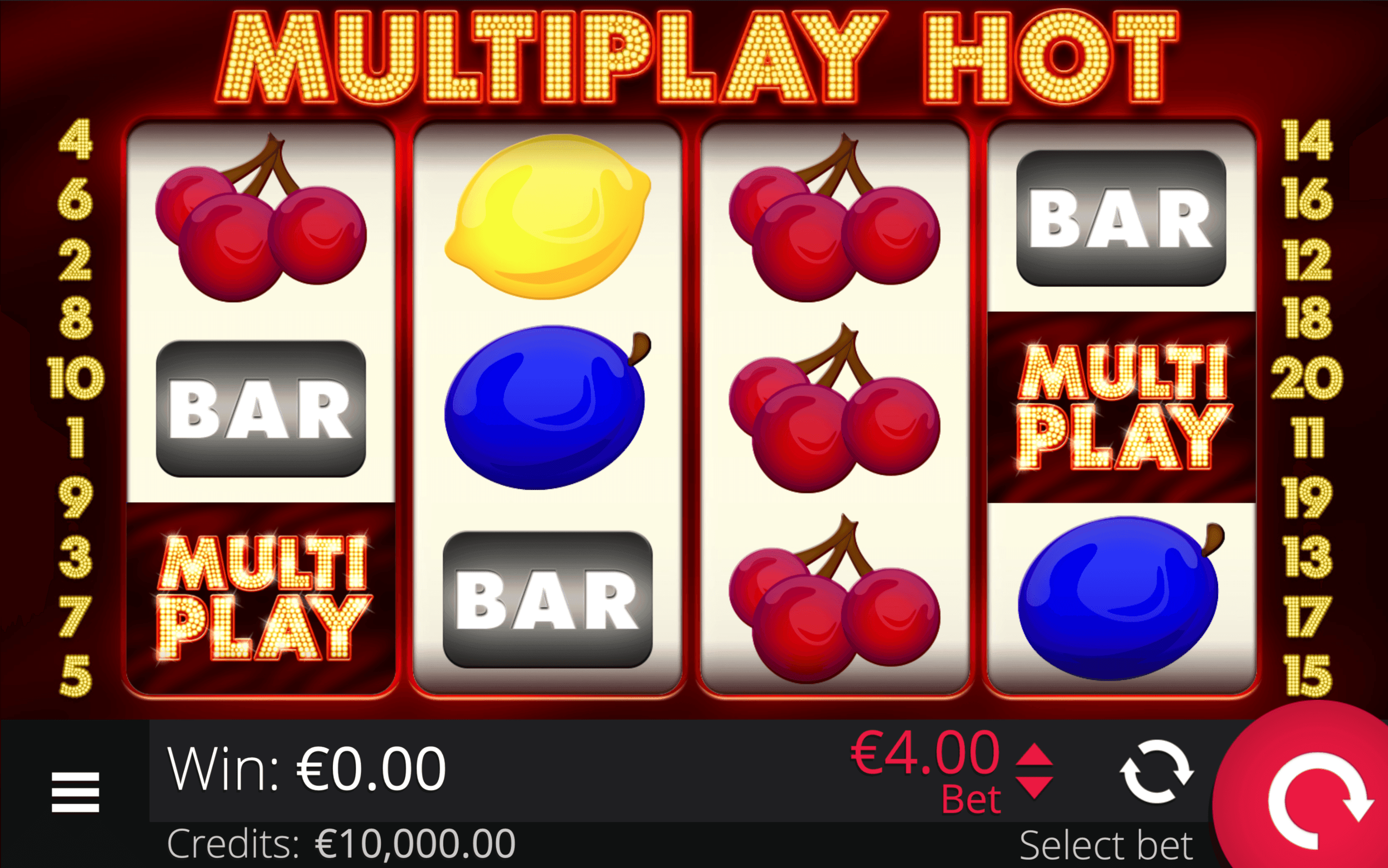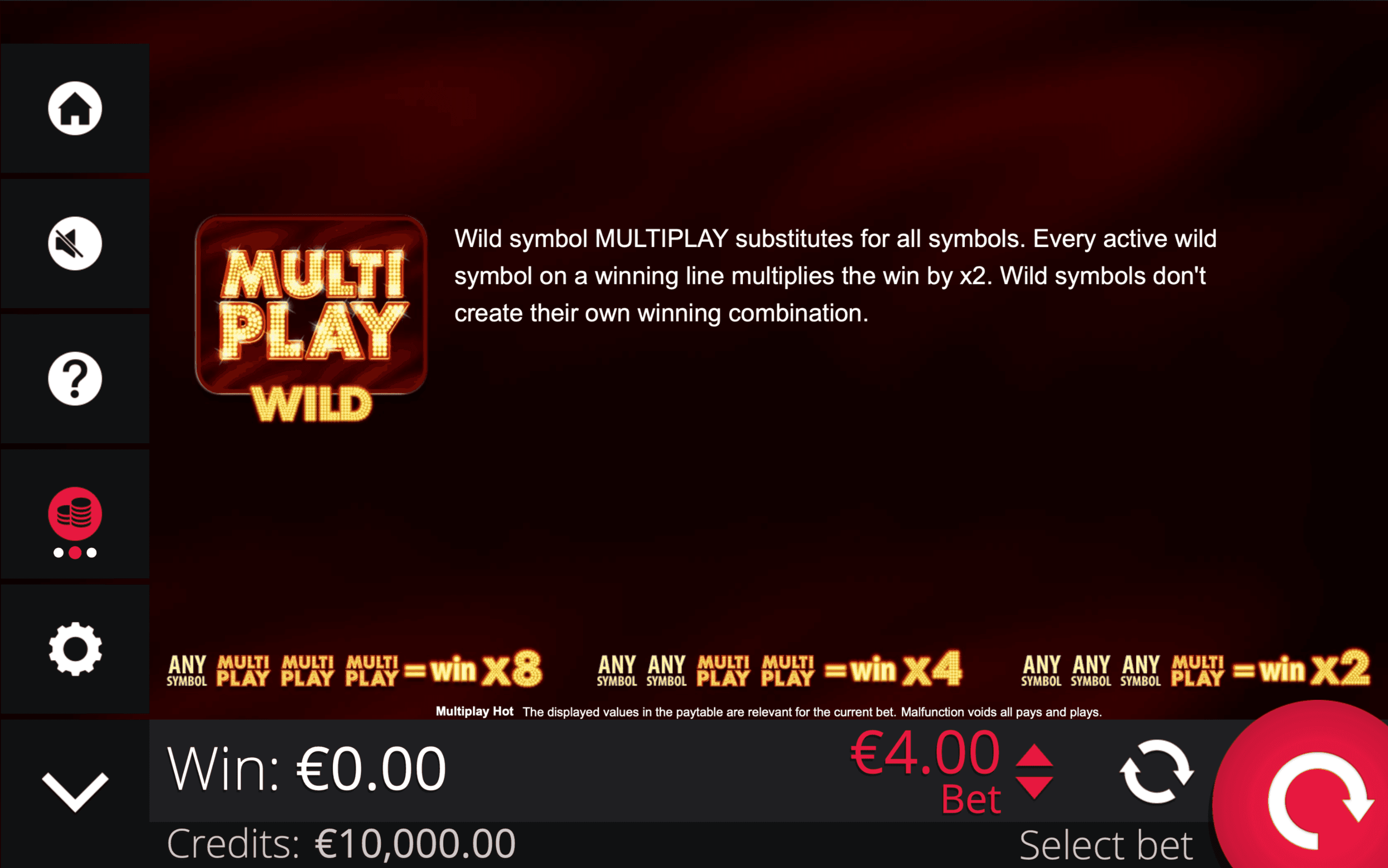 **MULTIPLAY HOT** is a 4×3 fruit slot with 20 paylines featuring the **Multiplay Wild**, which substitutes for other symbols and **multiplies wins** depending on how many wilds appear in a winning combination. The Wild does not create its own winning lines.