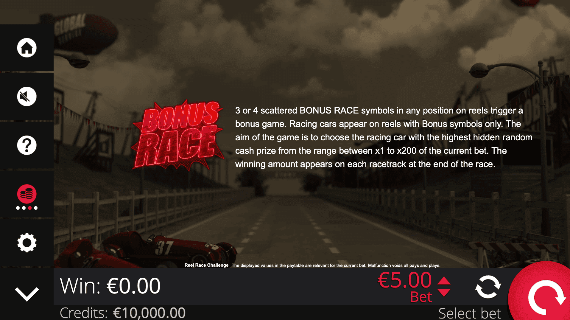 Landing 3 or 4 Bonus Race Symbols triggers the **Bonus Game**, where players pick one of several cars to reveal a random prize ranging from **×1 to ×200** of the total bet.