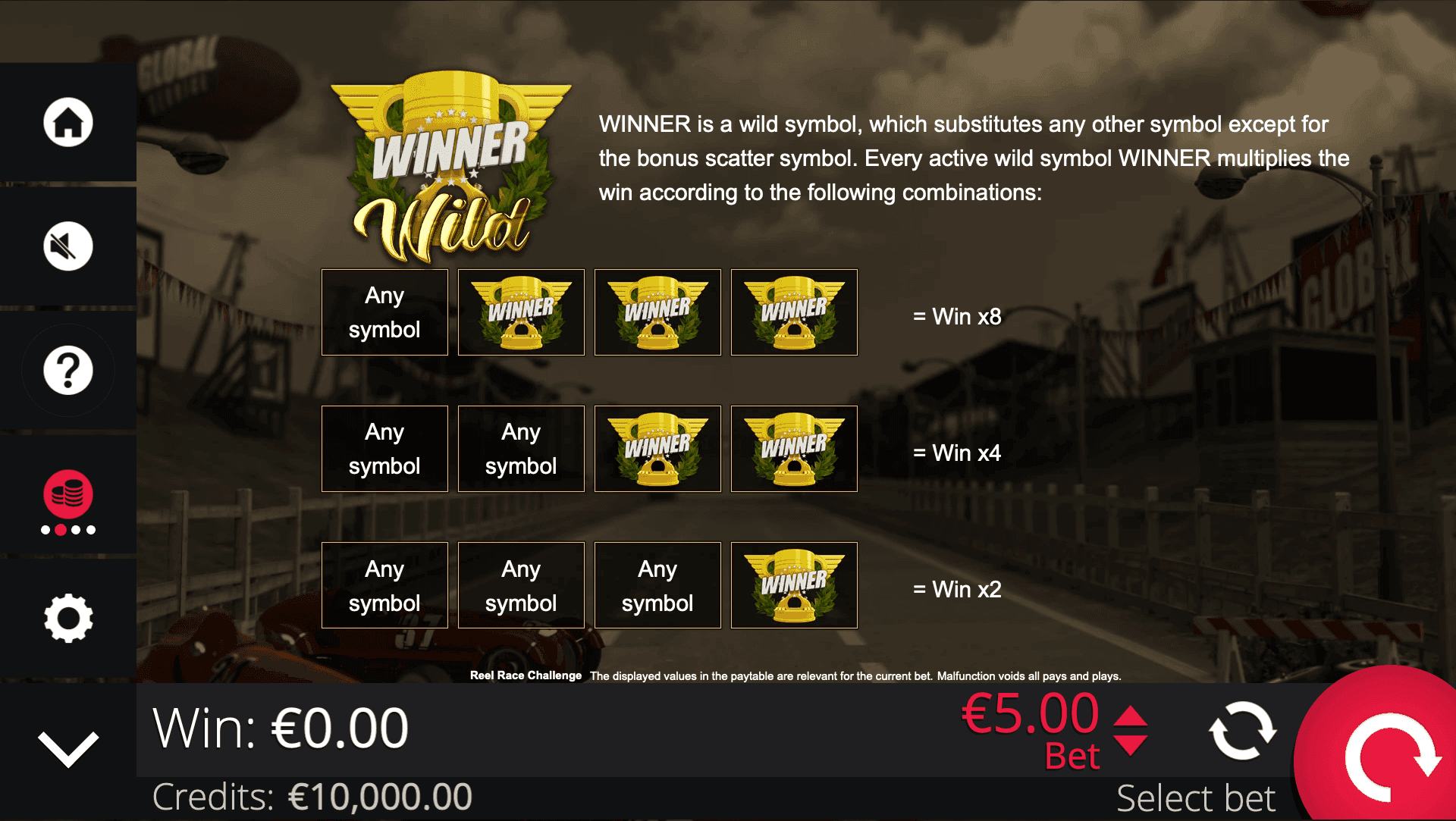 The **Winner Wild Symbol** substitutes for all regular symbols except **Bonus Race** and applies a **×2, ×4 or ×8 Multiplier**, depending on how many wilds appear in the winning line. Wild Multipliers stack up to a maximum of **×8**.