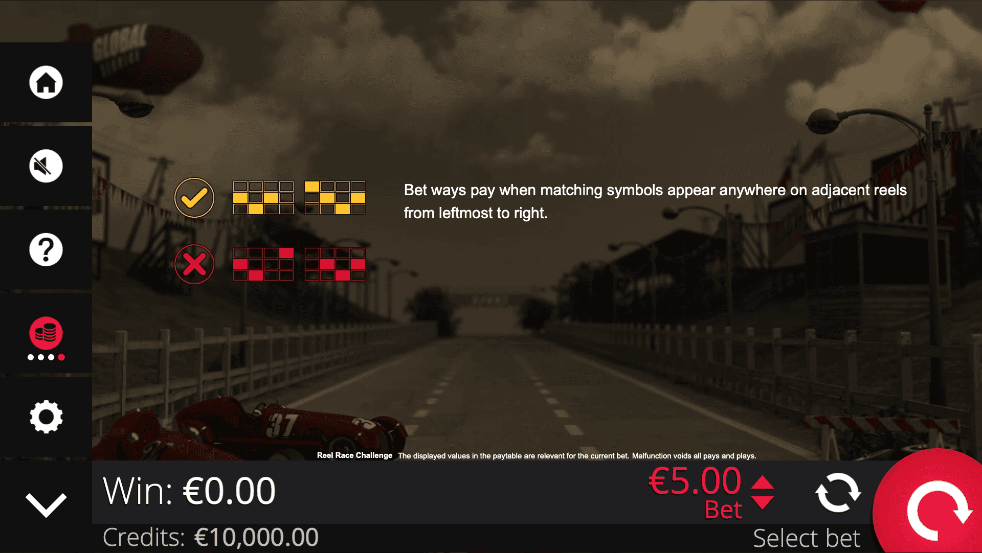 **REEL RACE CHALLENGE** is a 4×3 slot with **81 fixed paylines**, awarding wins for three or more matching symbols on consecutive reels from left to right.