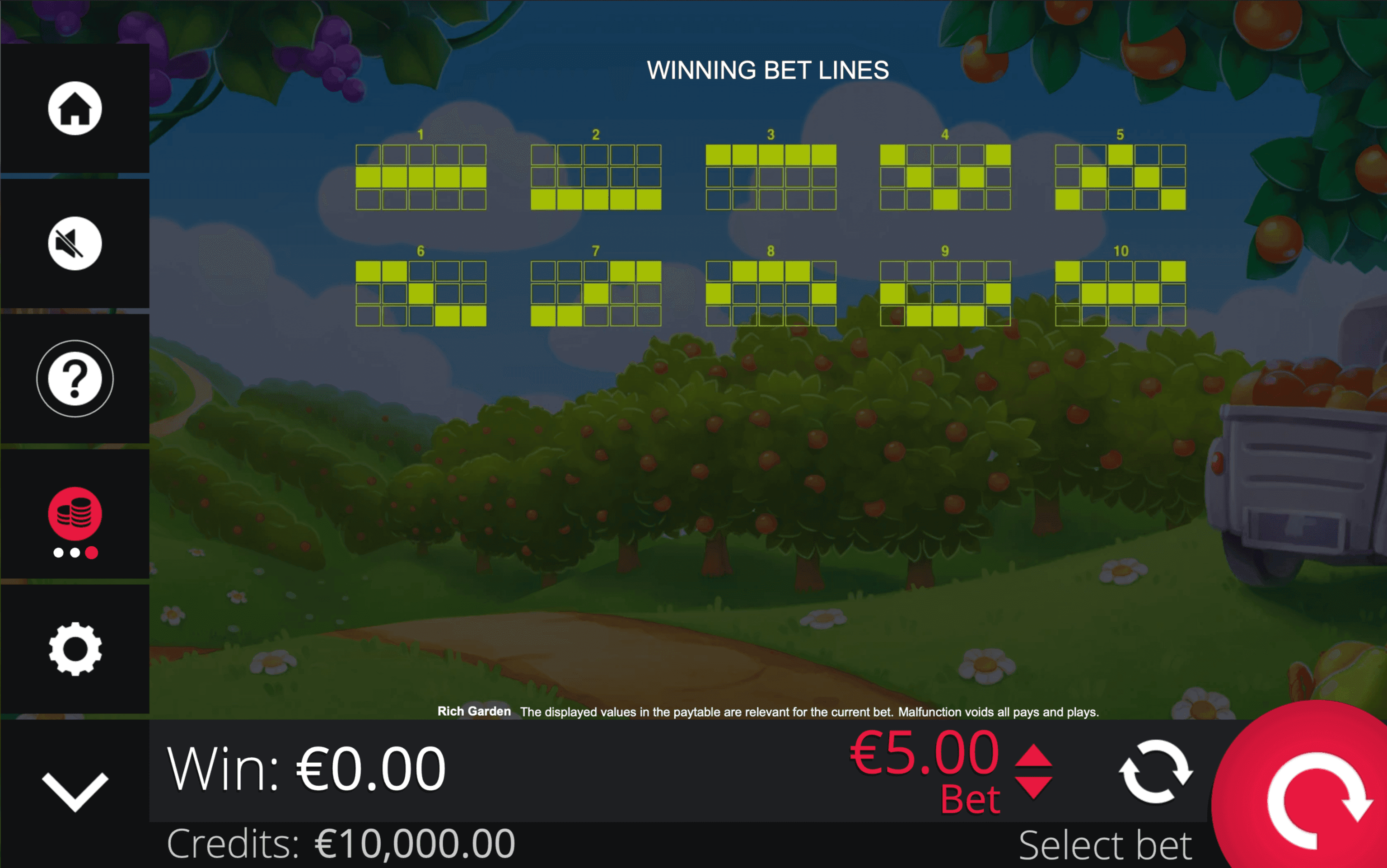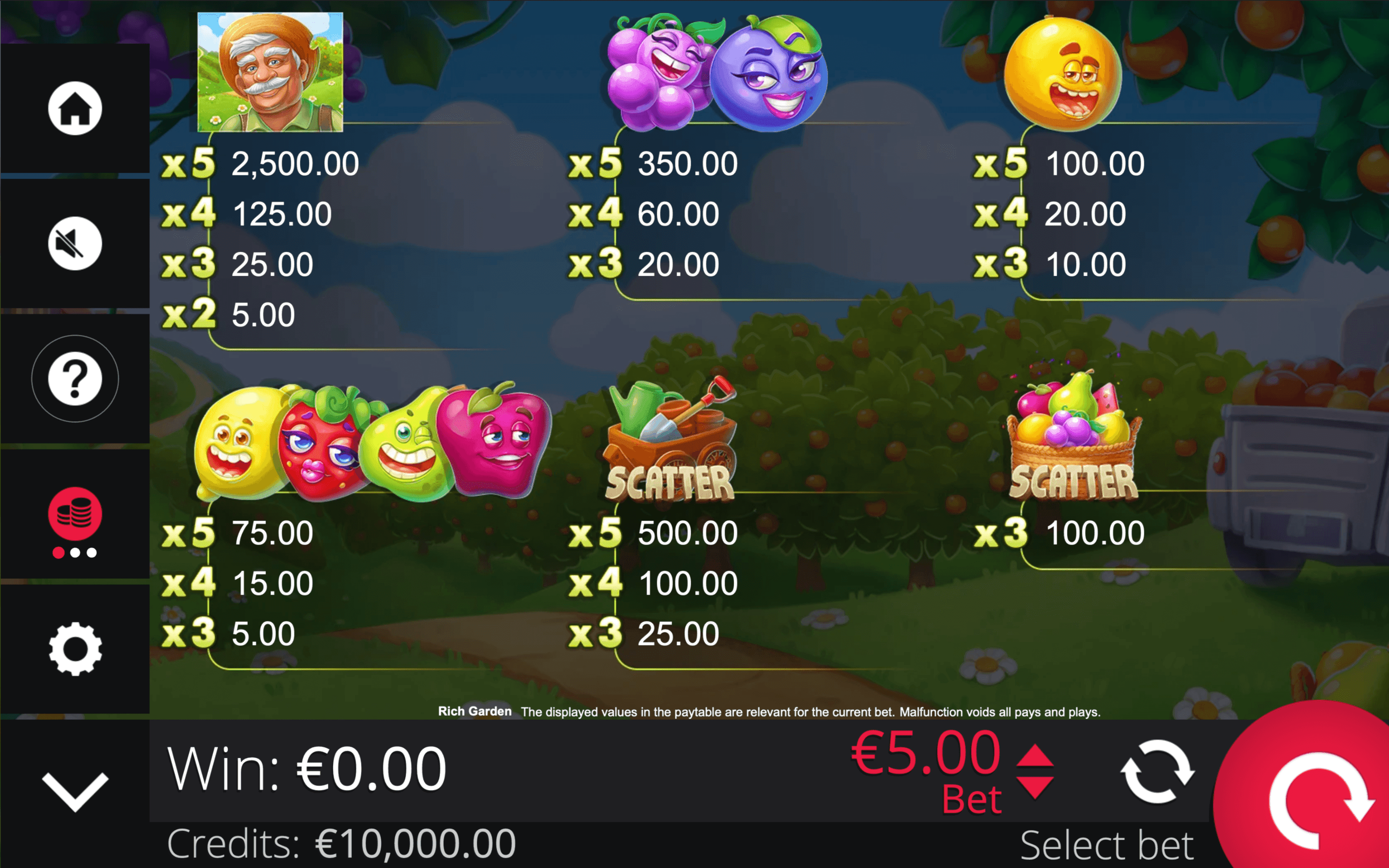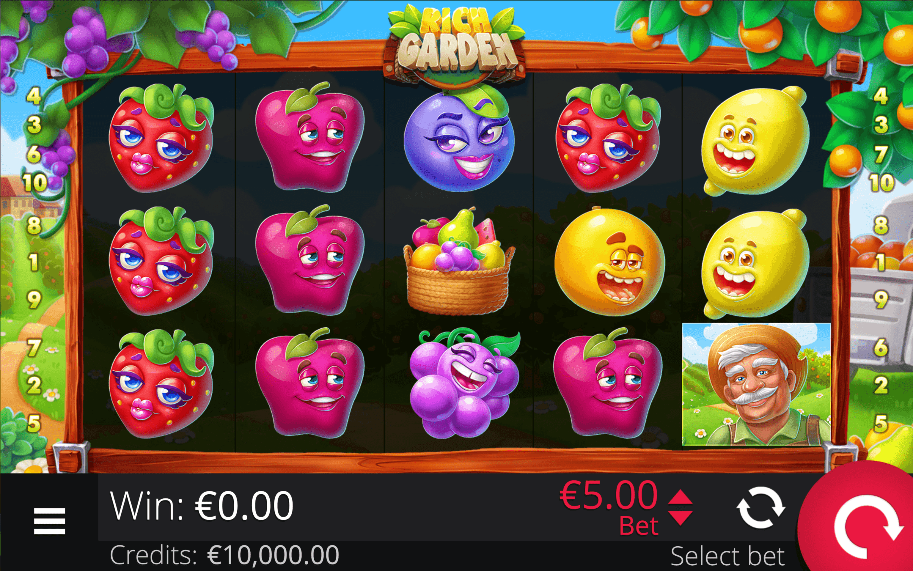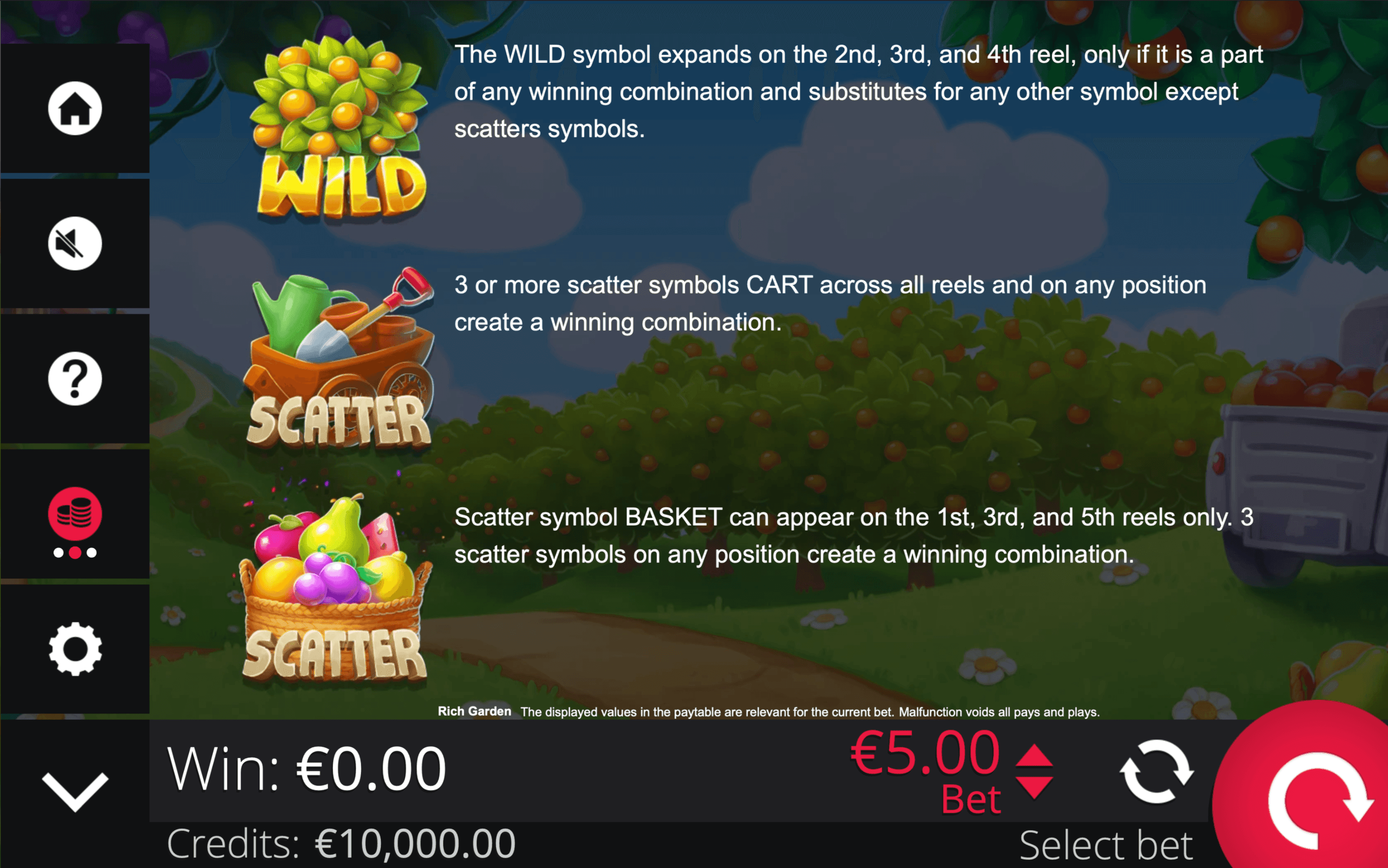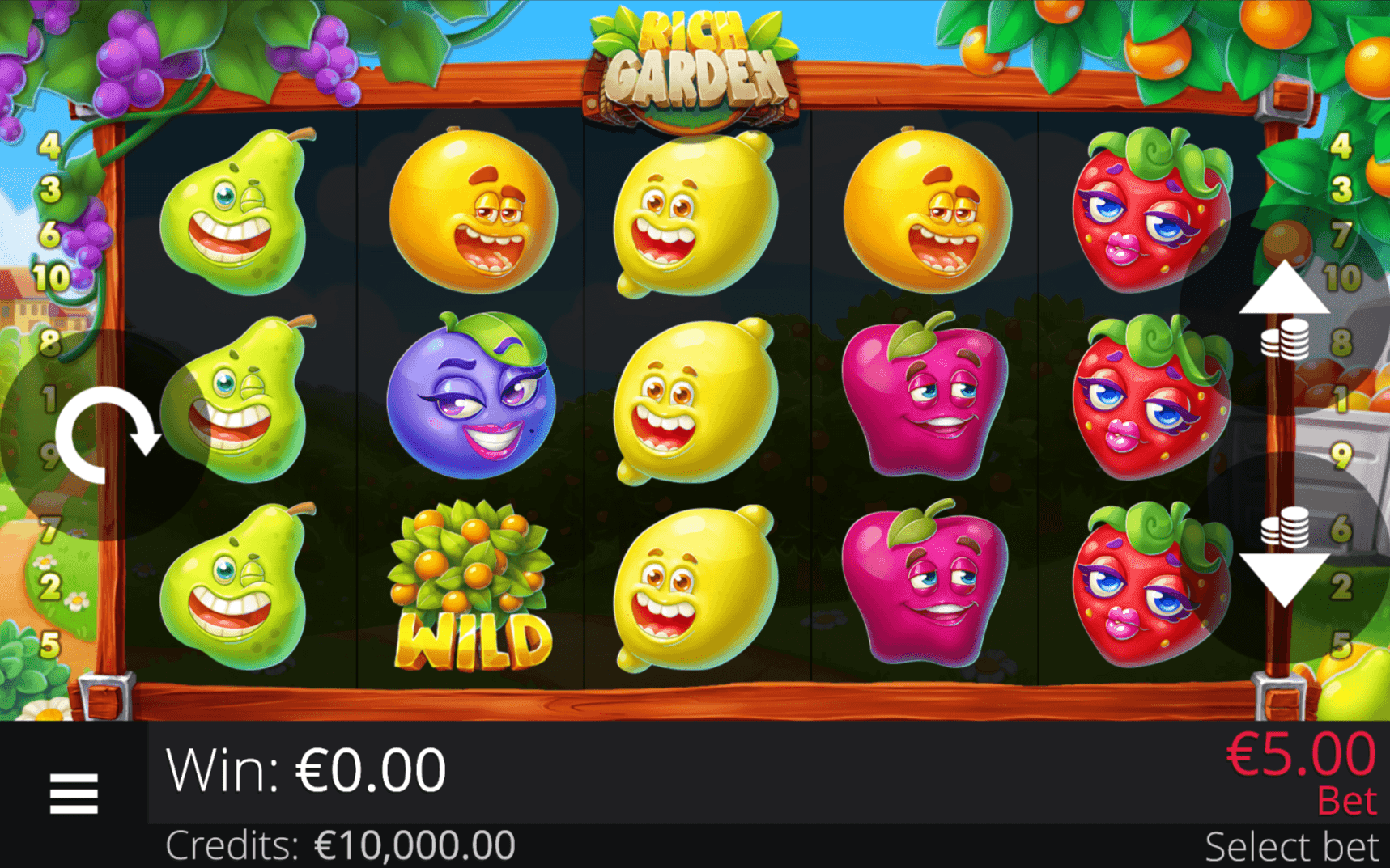 **RICH GARDEN** is a **5×3 fruit slot** with **10 paylines** and two distinct Scatter Symbols that award wins regardless of their position. The game also features an **Expanding Wild** that grows to cover its reel when part of a win.
