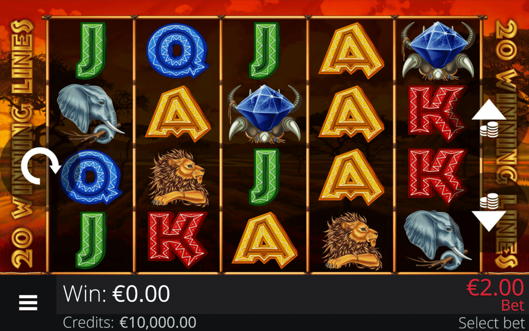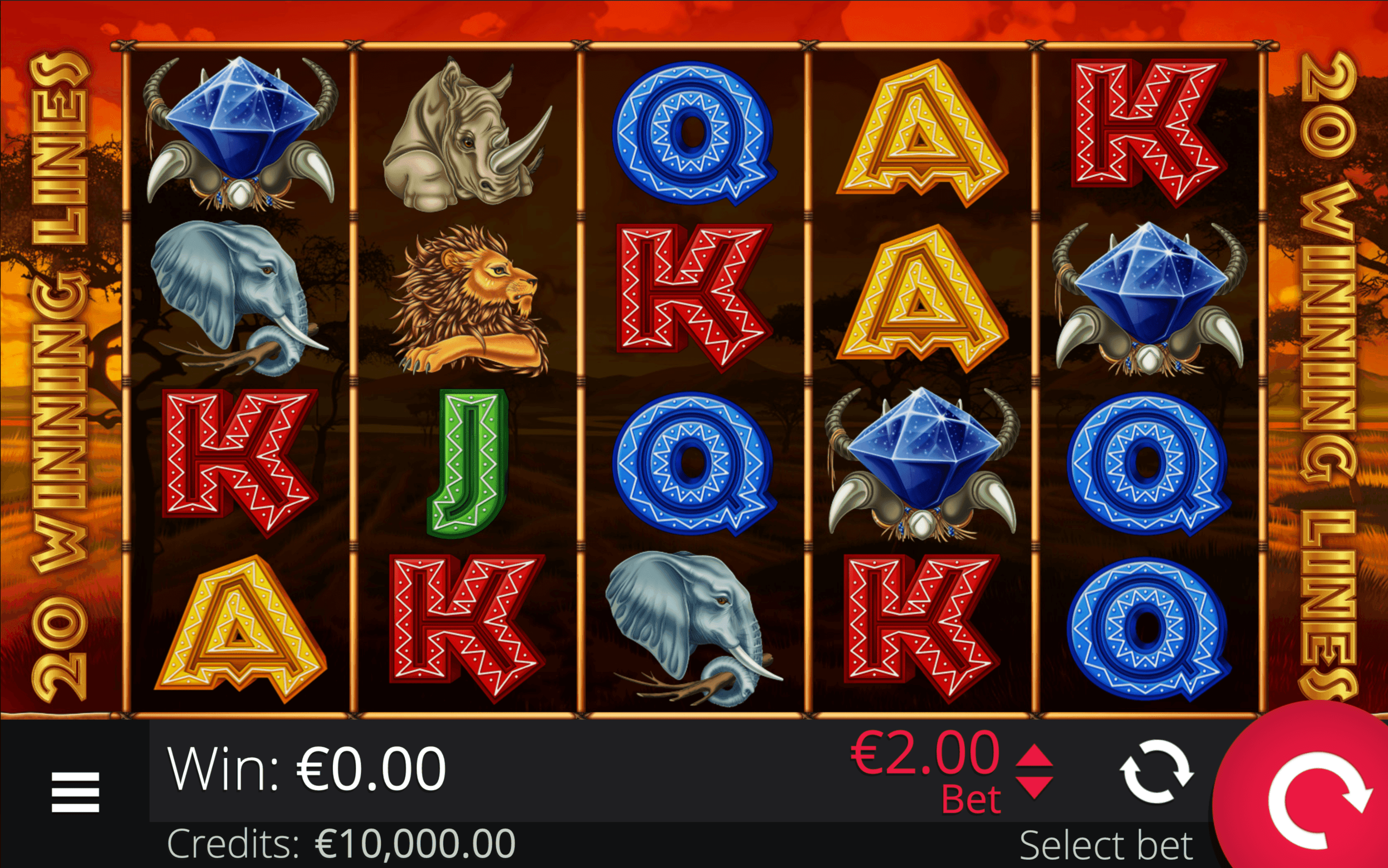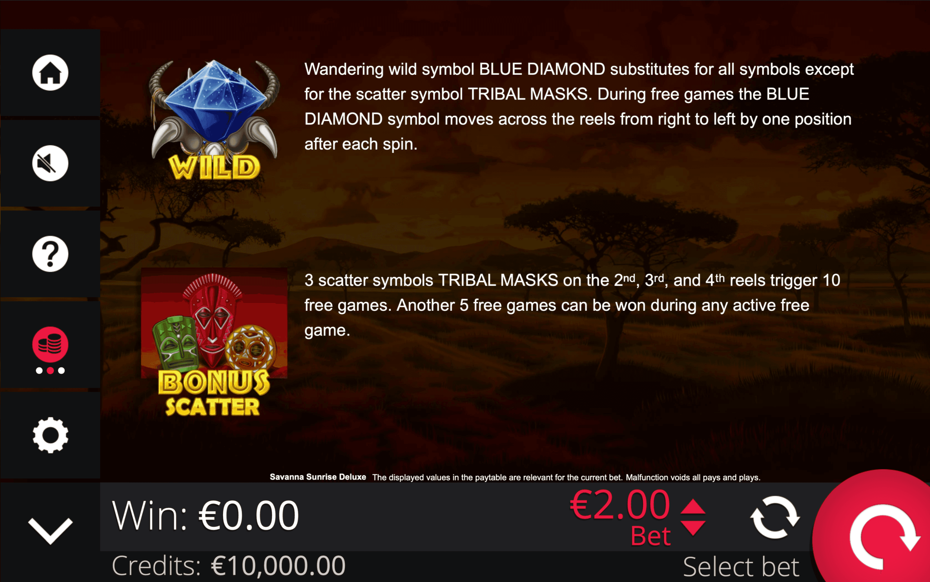 **SAVANNA SUNRISE DELUXE** is a 5-reel, 4-row slot with 20 paylines. Blue Diamond Wild substitute for all symbols except Tribal Mask Scatters and double any win they form on active paylines.
