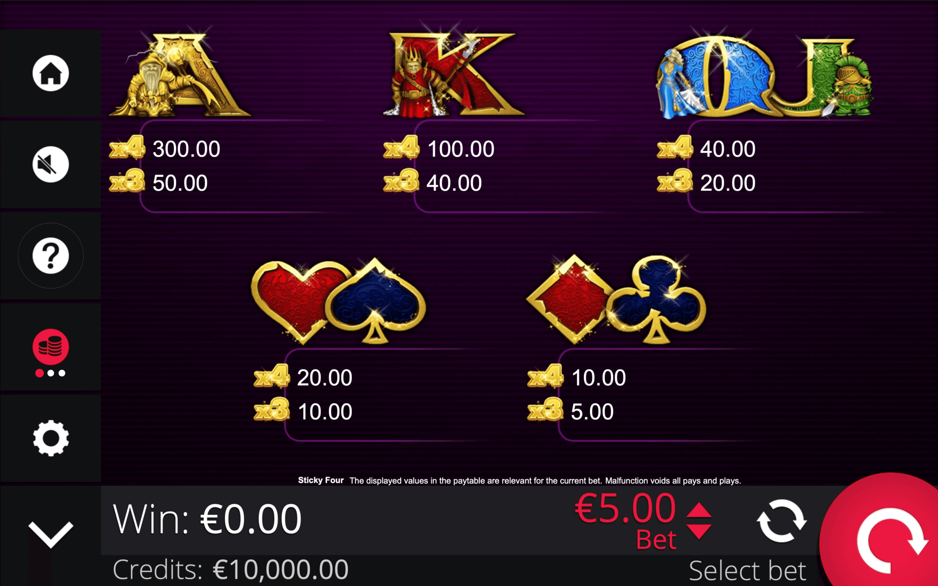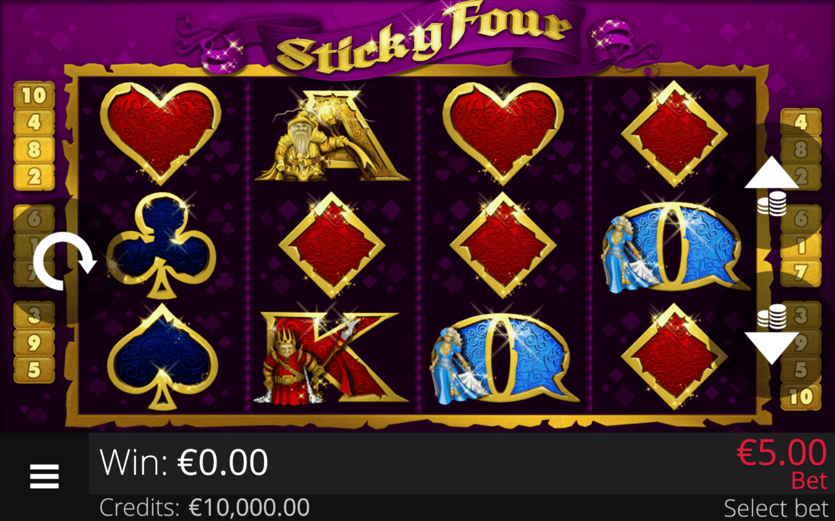 **STICKY FOUR** is a 4×3 slot with 10 paylines, featuring classic card suits, character symbols and the powerful **Shield Wild**. Wins form left to right with three or four matching symbols across adjacent reels.