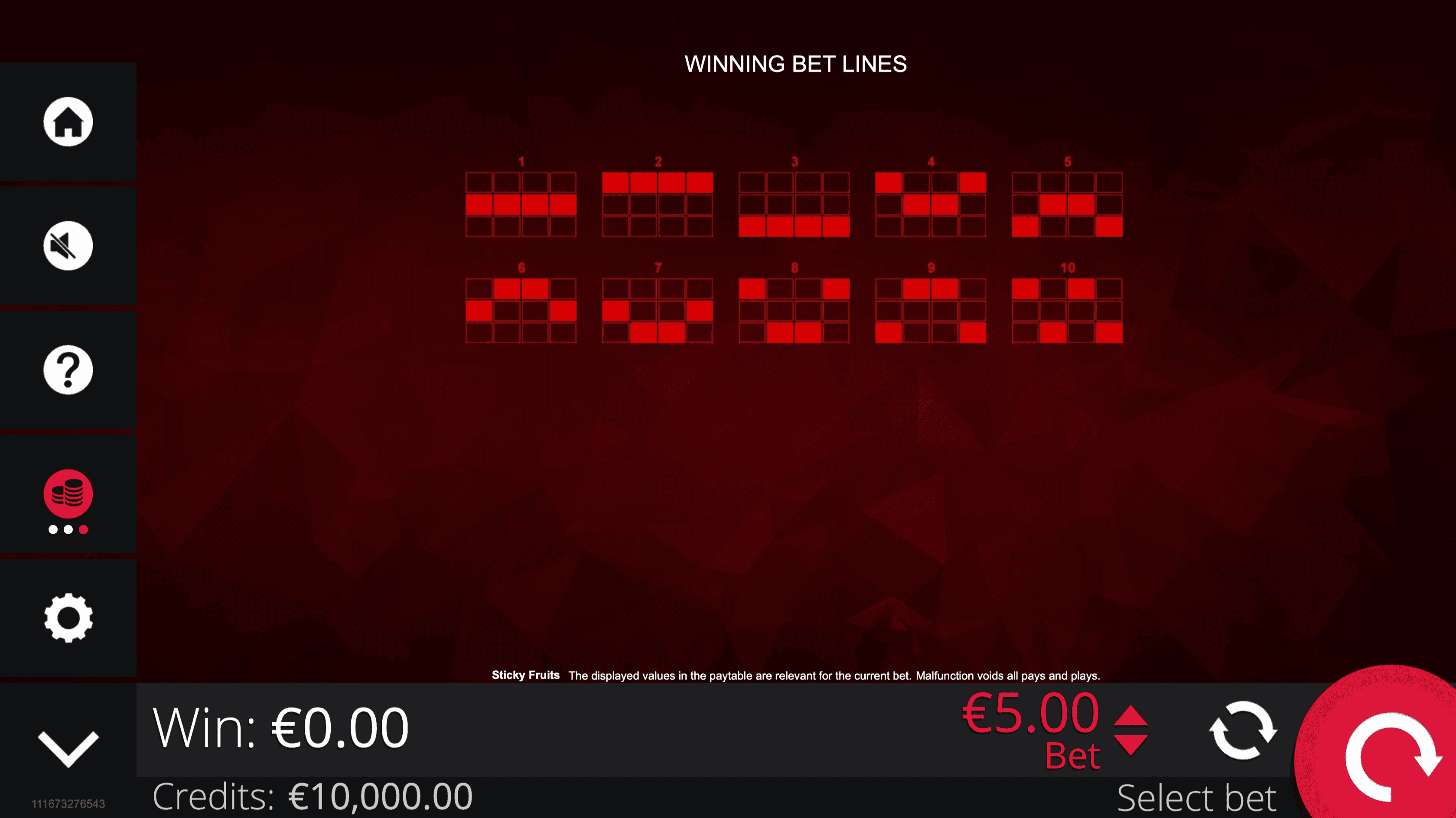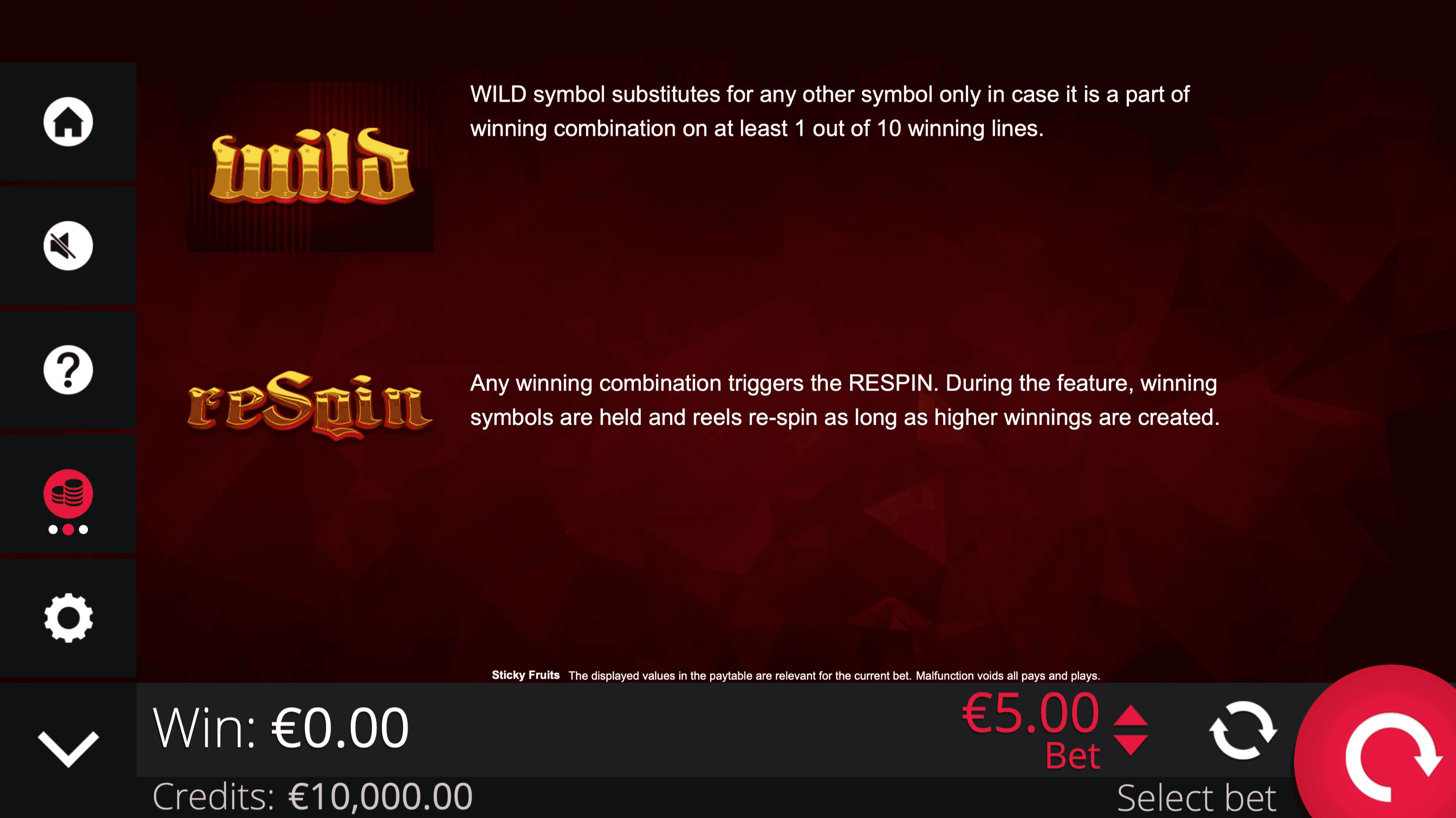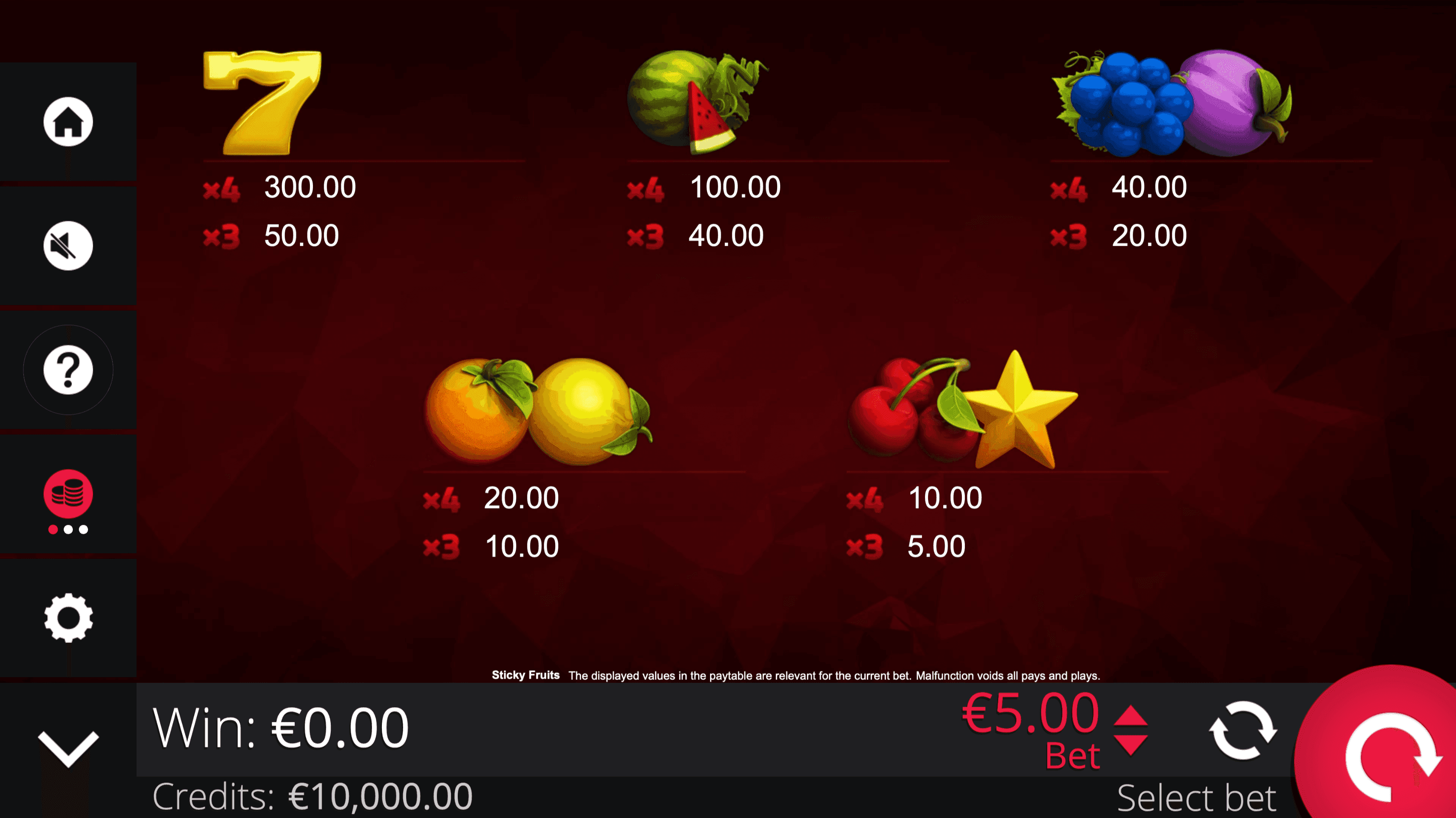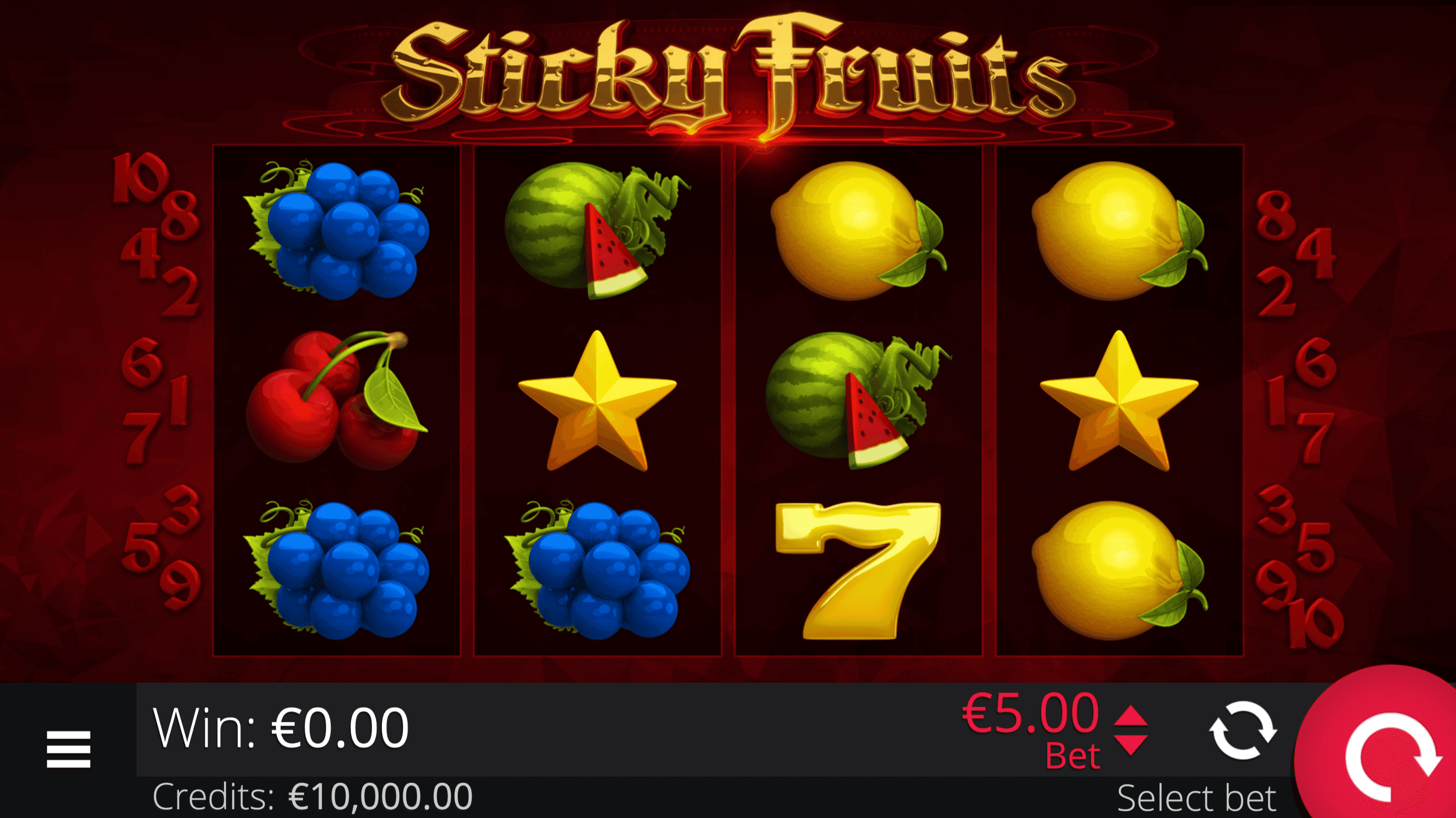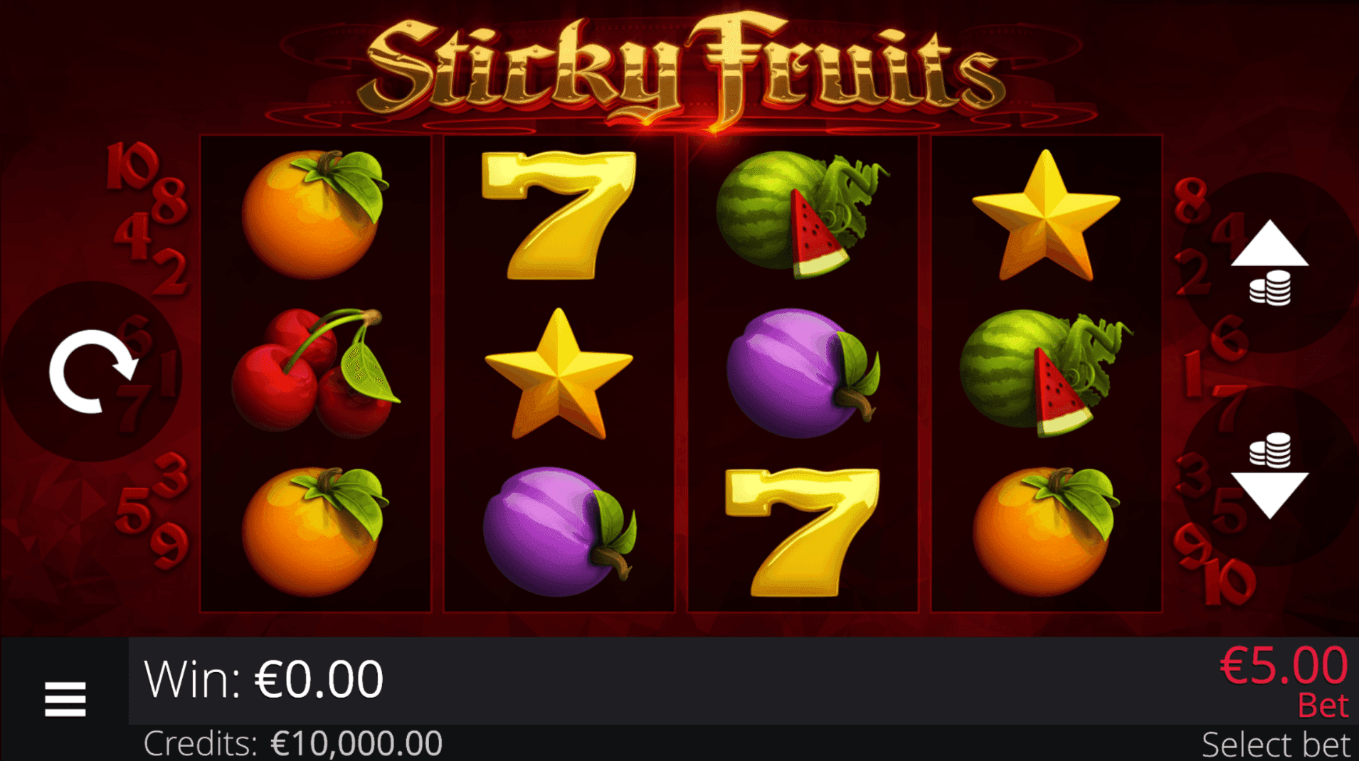 **STICKY FRUITS** is a vibrant **4×3 slot** with **10 paylines**, packed with colorful fruit symbols and **Wild** that can substitute for other symbols. Winning combinations are formed from left to right, requiring three or more matching symbols on consecutive reels.