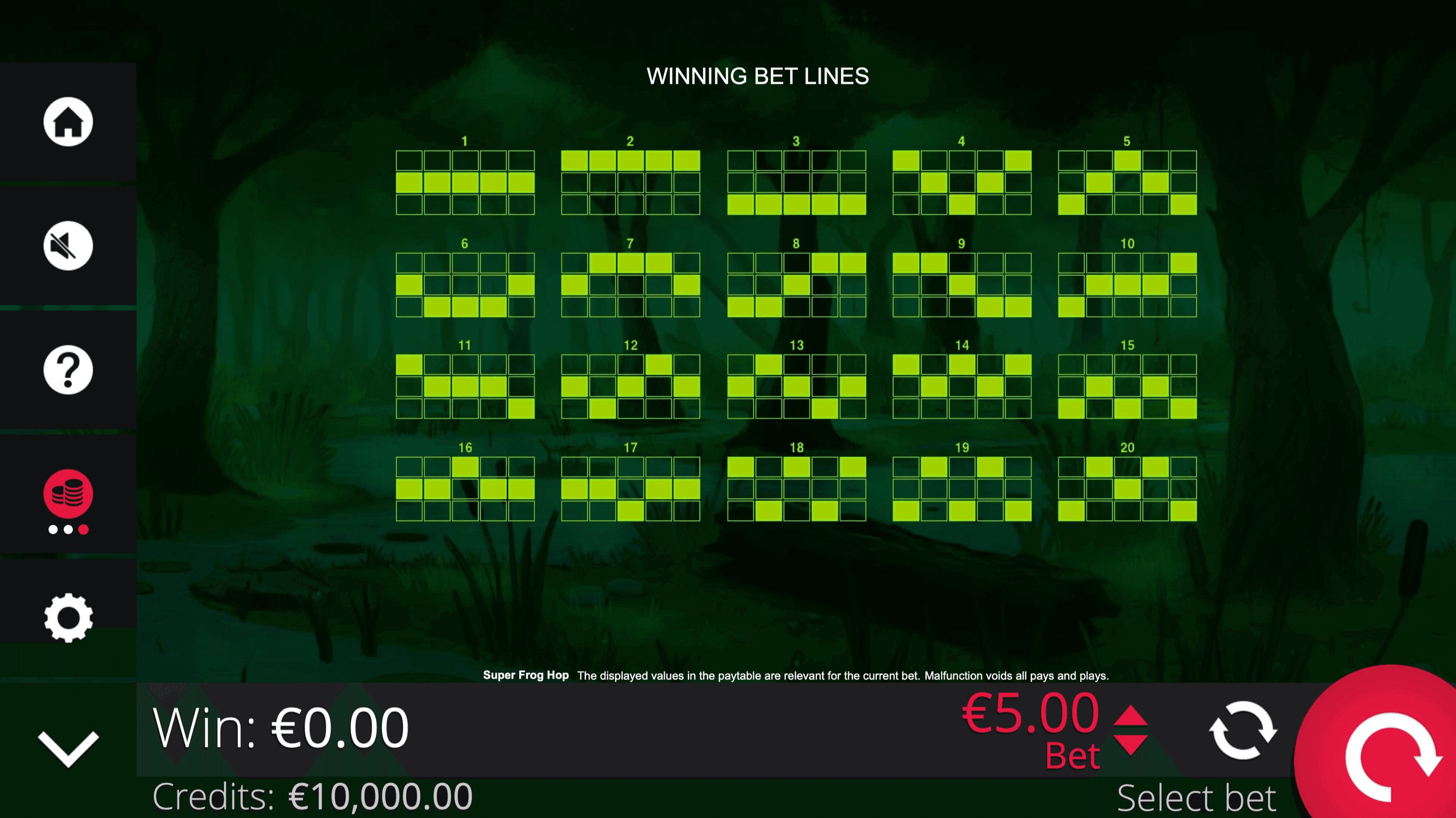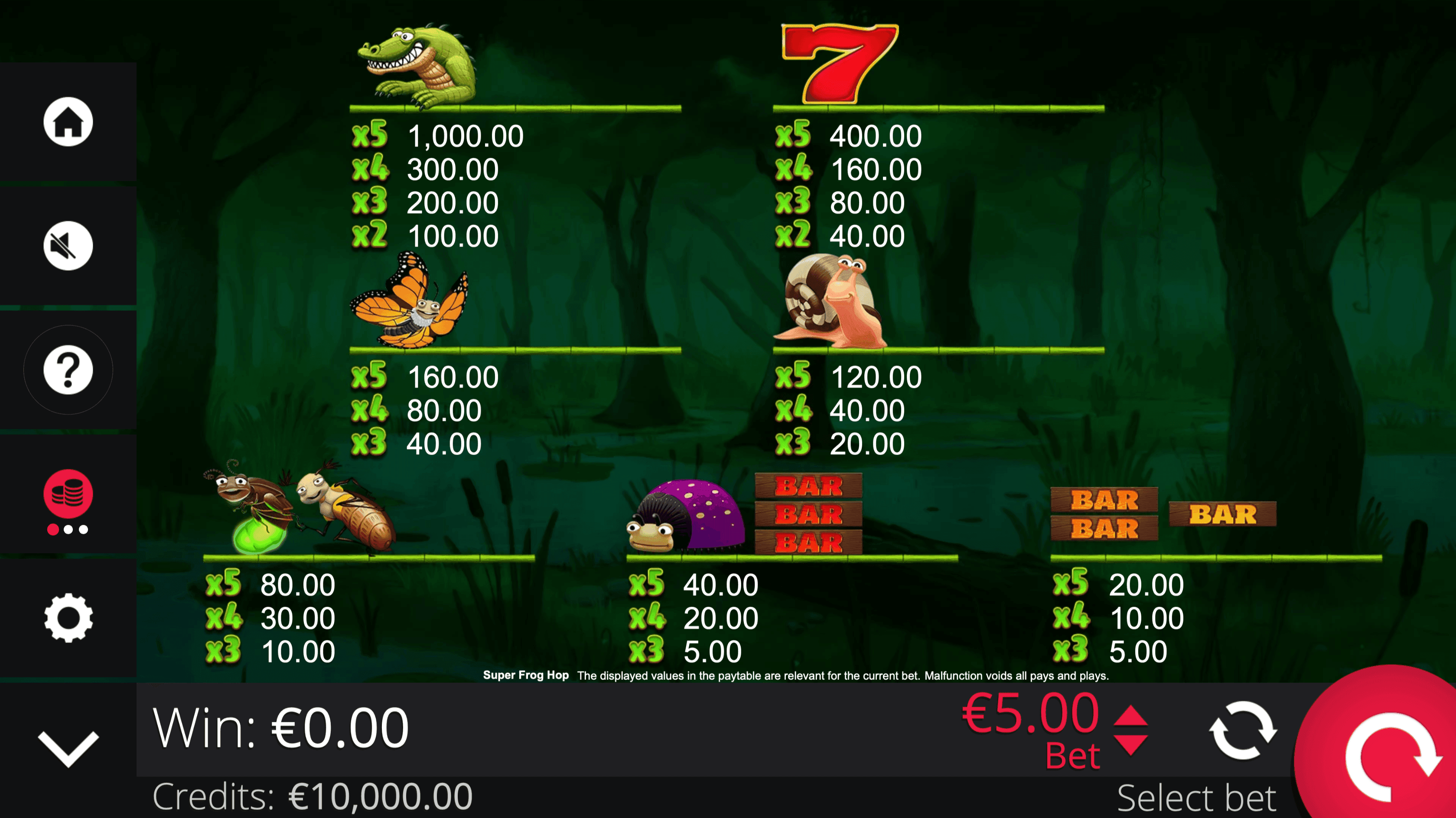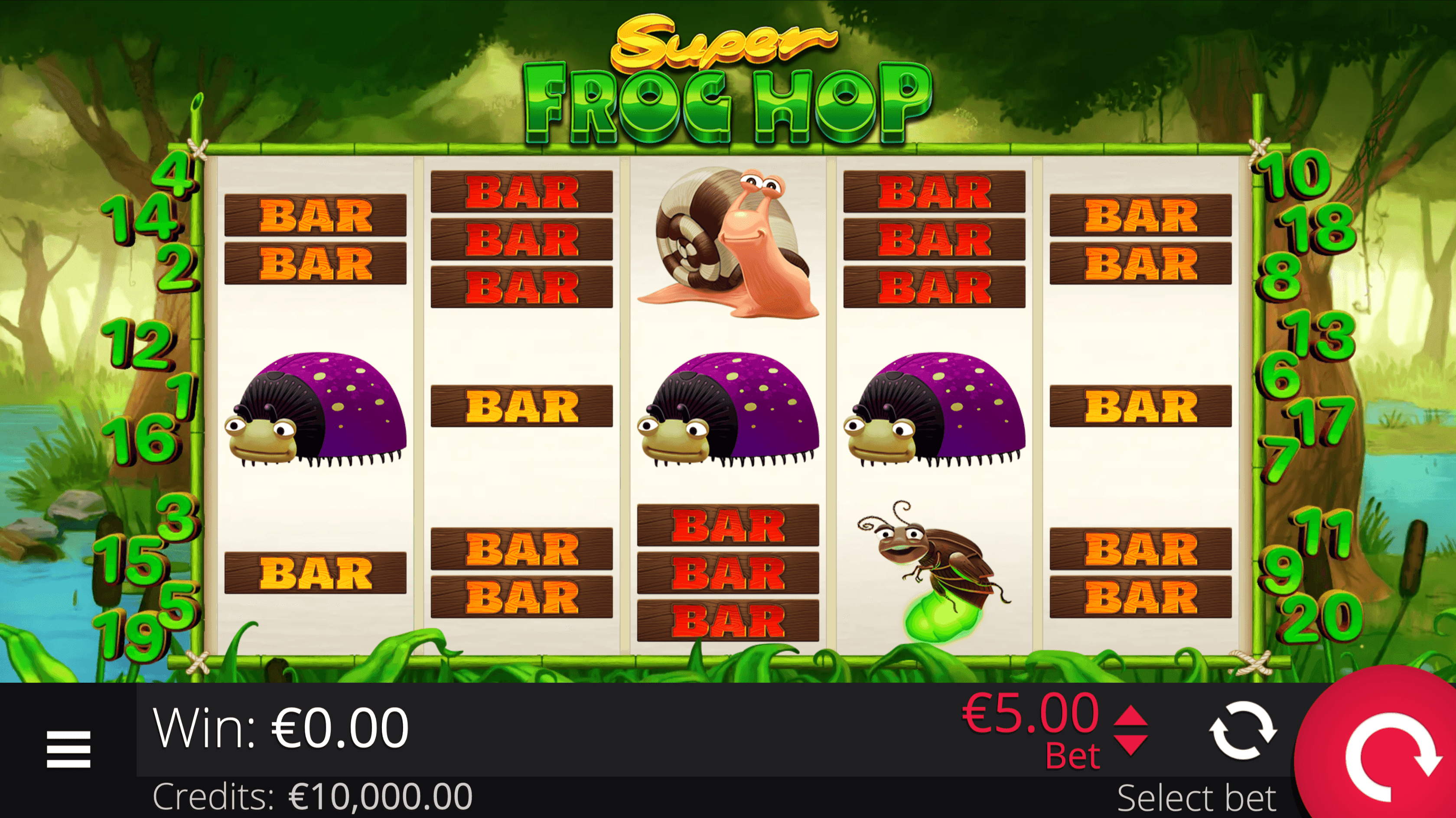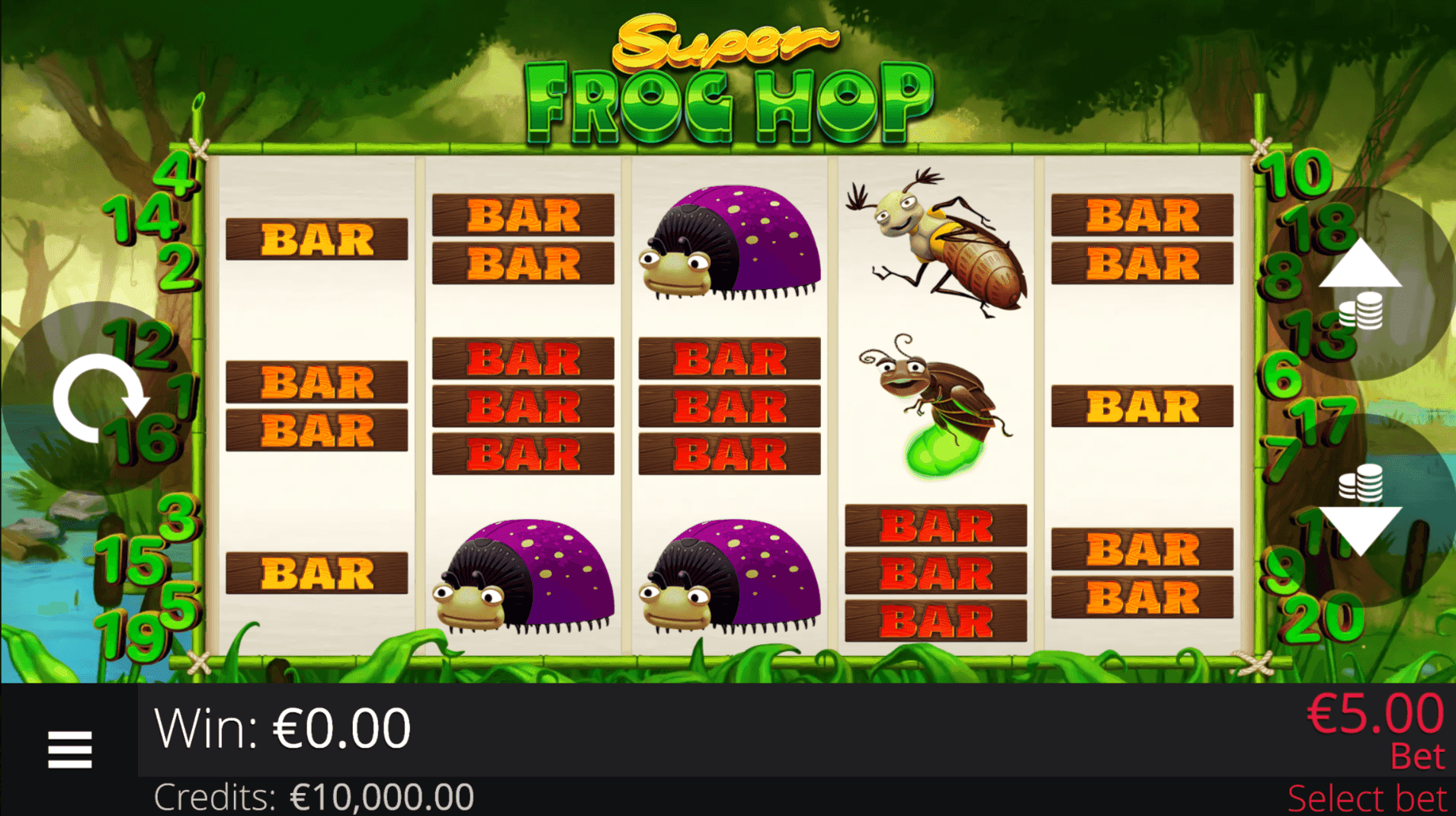 **SUPER FROG HOP** brings a swamp of frogs, insects, and chameleons to 5 reels and 20 paylines. Wild Symbol Chameleon substitute for other symbols and multiply wins **up to ×16** across active paylines. Landing 3 Scatter Frog Symbols on reels 2, 3, and 4 triggers the **Frog Hop Bonus**, where dice rolls advance the frog along a board to collect **Multipliers**, **Mystery Prizes**, or extra rolls. Up to 4 dice rolls are allowed per bonus round. The bonus ends when the frog reaches the final space, is caught by the crocodile, or runs out of rolls. All bonus winnings are added to the global Free Bank and credited at the end of the bonus.