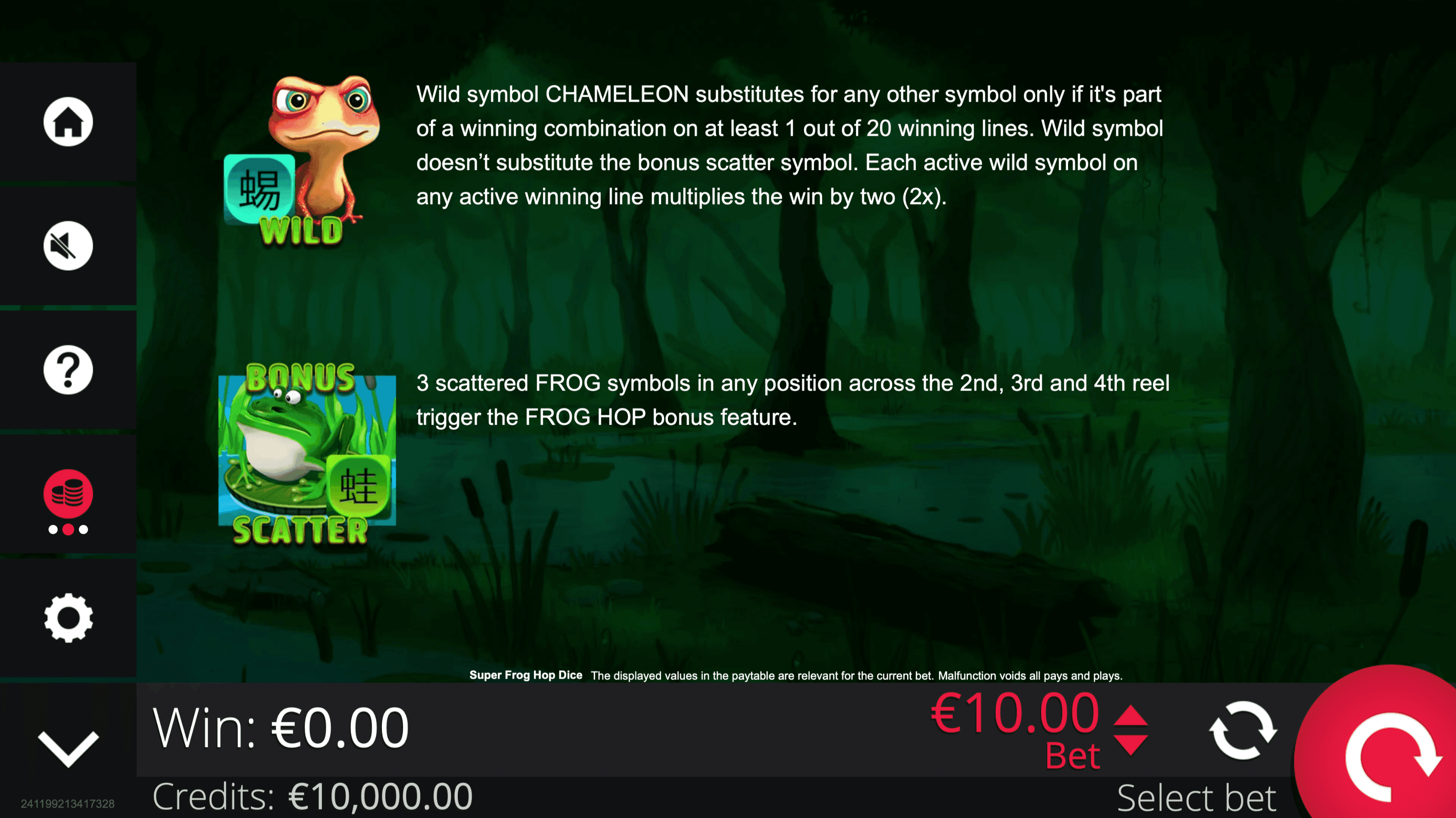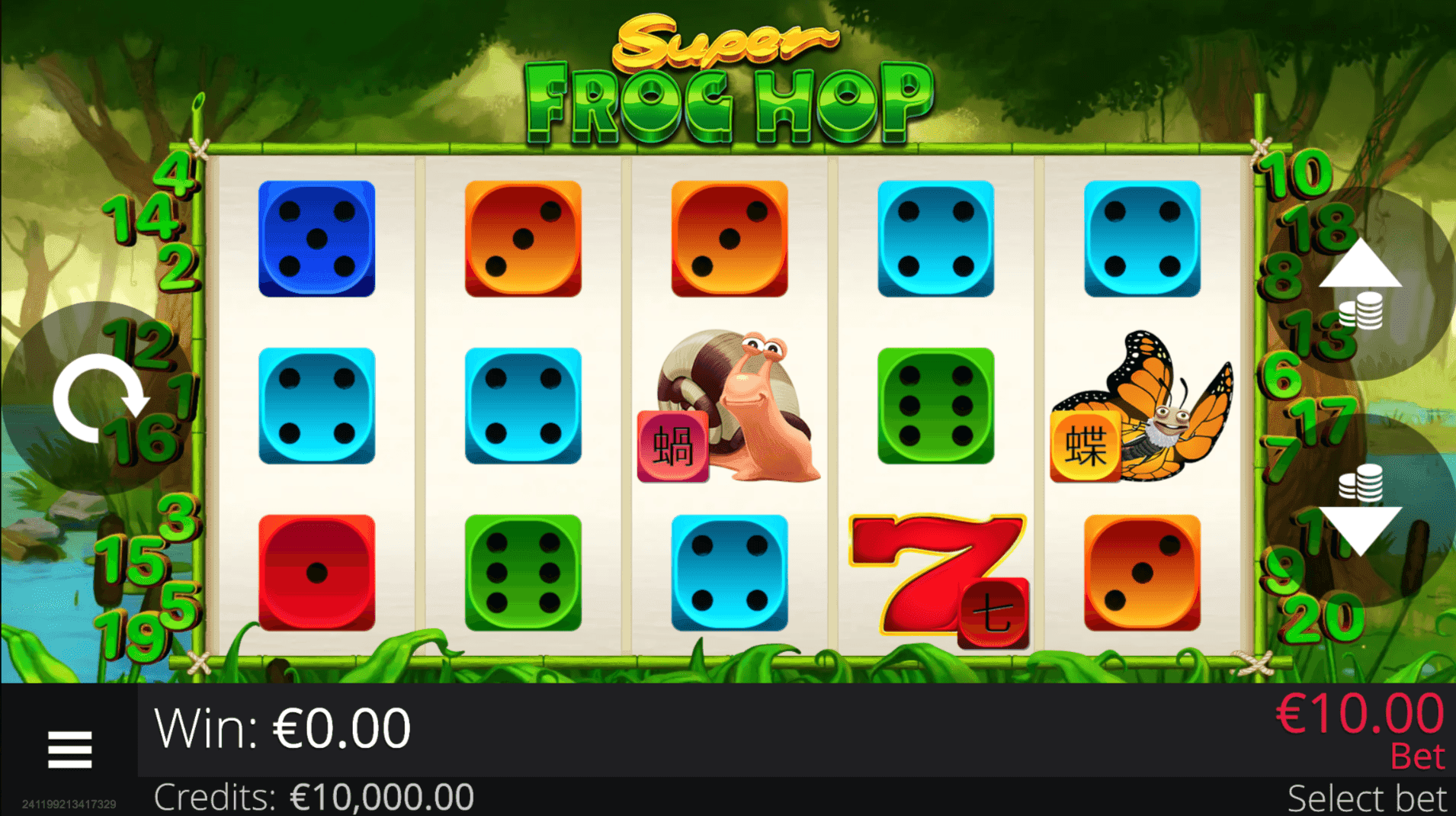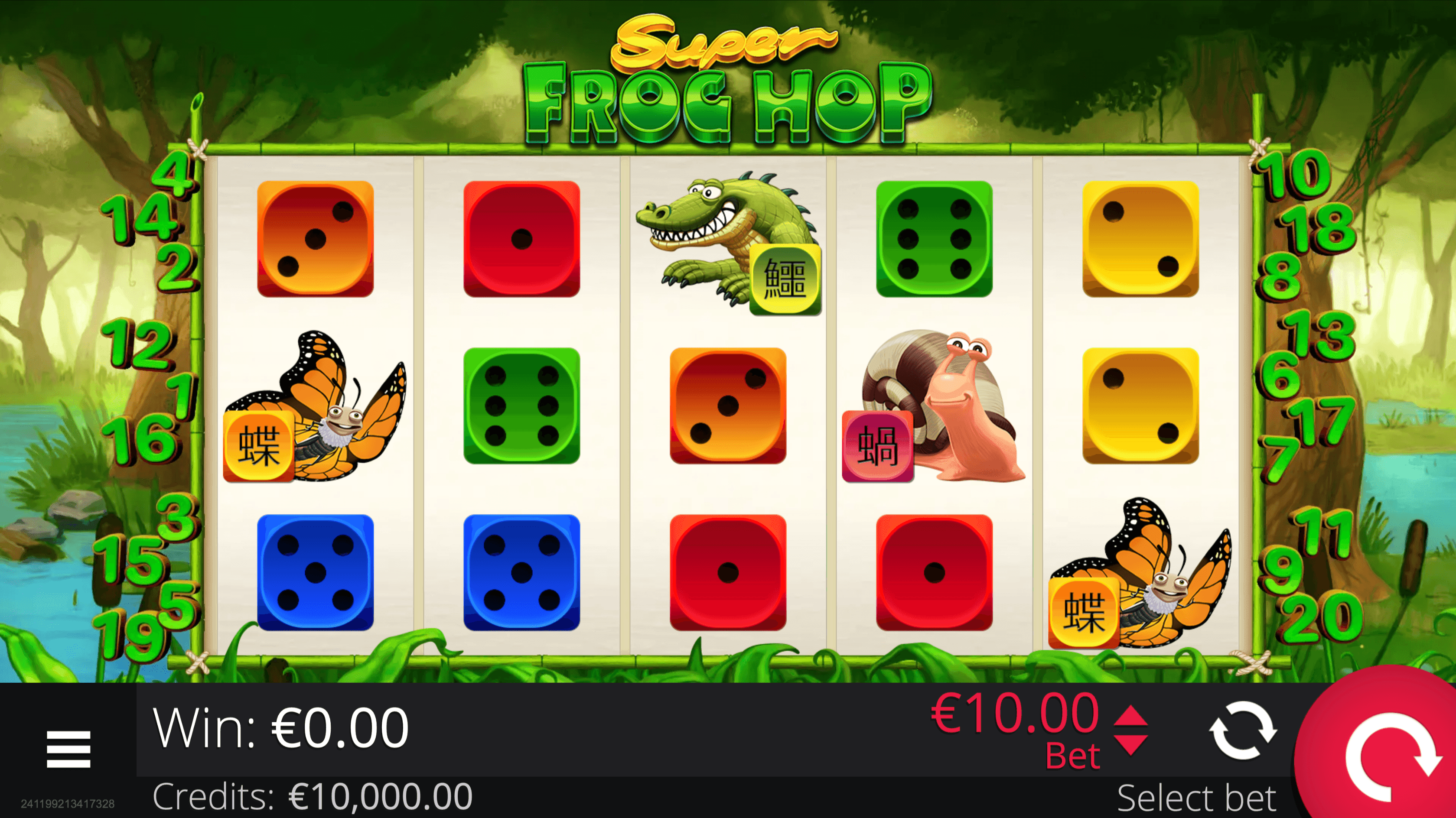**SUPER FROG HOP DICE** brings a swamp of frogs, insects, and chameleons to 5 reels and 20 paylines. Wild Symbol Chameleon substitute for other symbols and multiply wins **up to ×16** across active paylines. Landing 3 Scatter Frog Symbols on reels 2, 3, and 4 triggers the **Frog Hop Bonus**, where dice rolls advance the frog along a board to collect **Multipliers**, **Mystery Prizes**, or extra rolls. Up to 4 dice rolls are allowed per bonus round. The bonus ends when the frog reaches the final space, is caught by the crocodile, or runs out of rolls. All bonus winnings are added to the global Free Bank and credited at the end of the bonus.