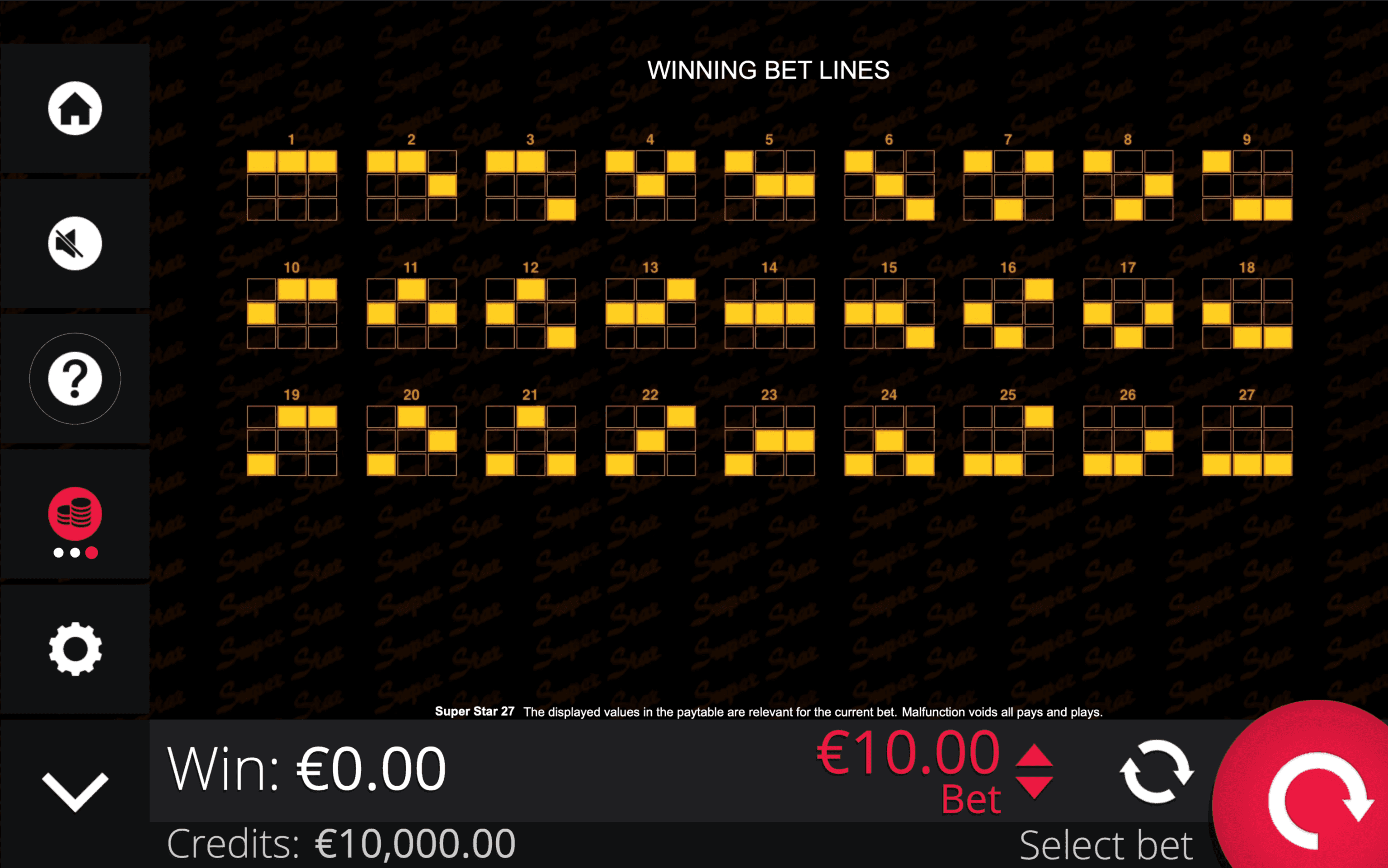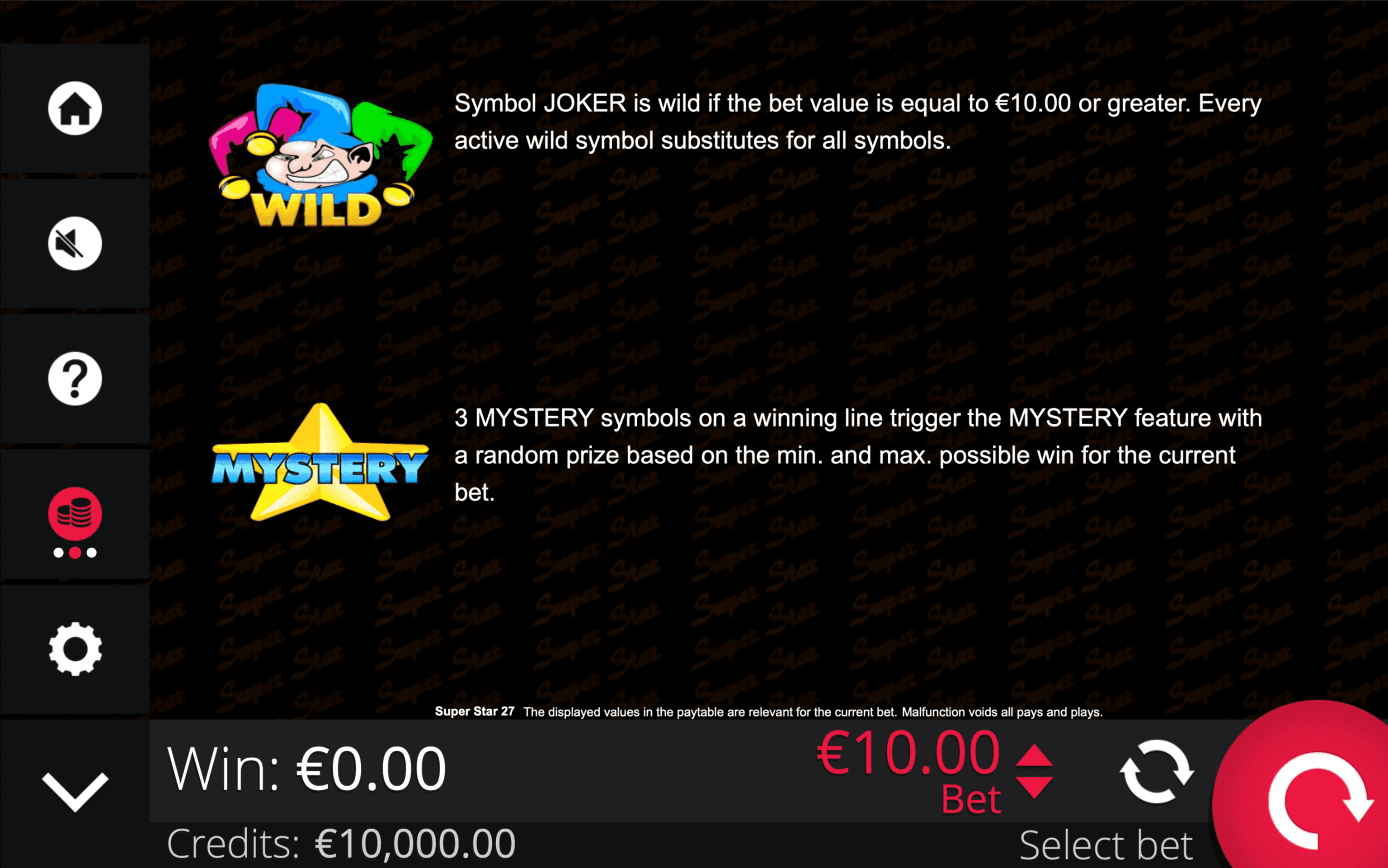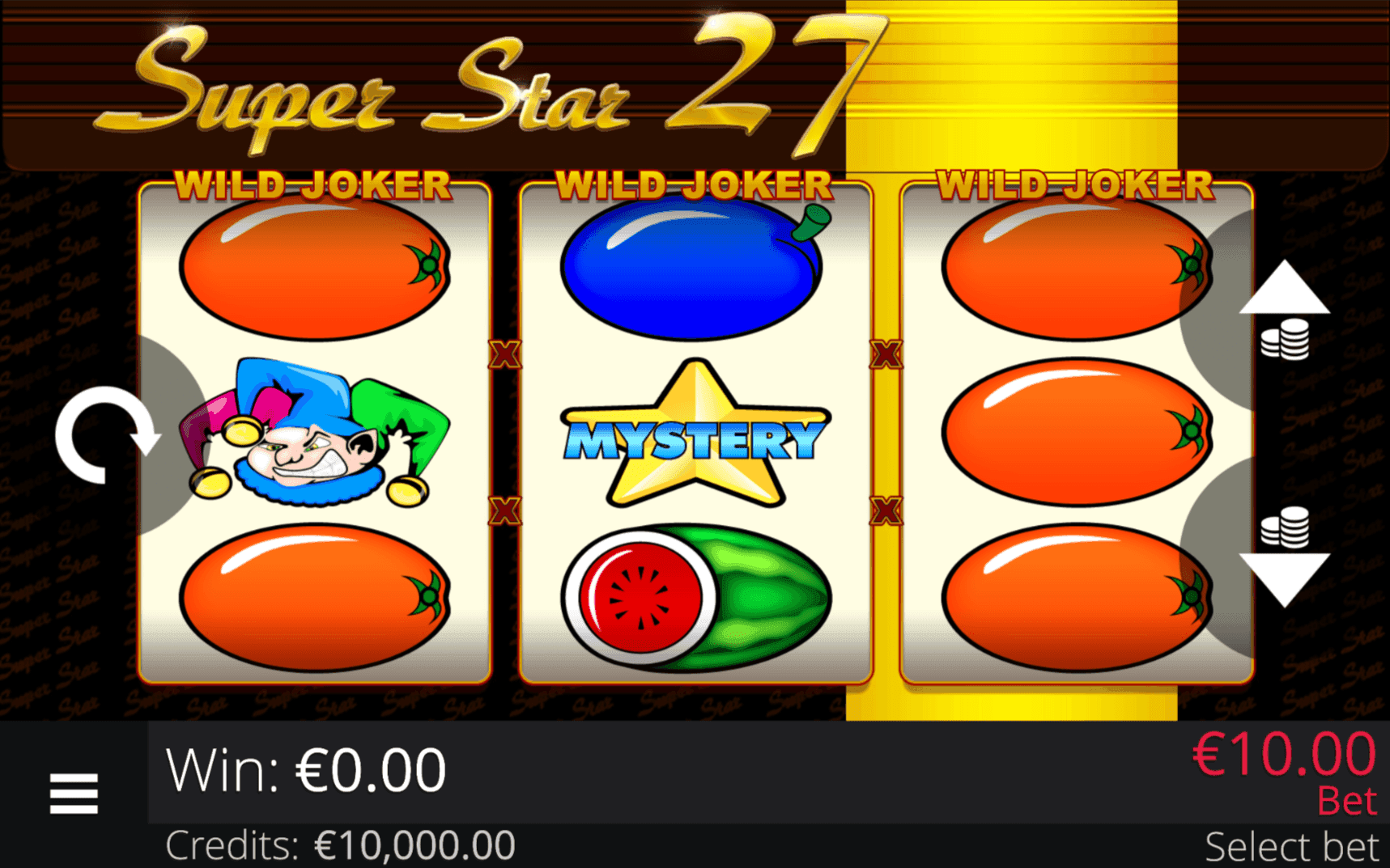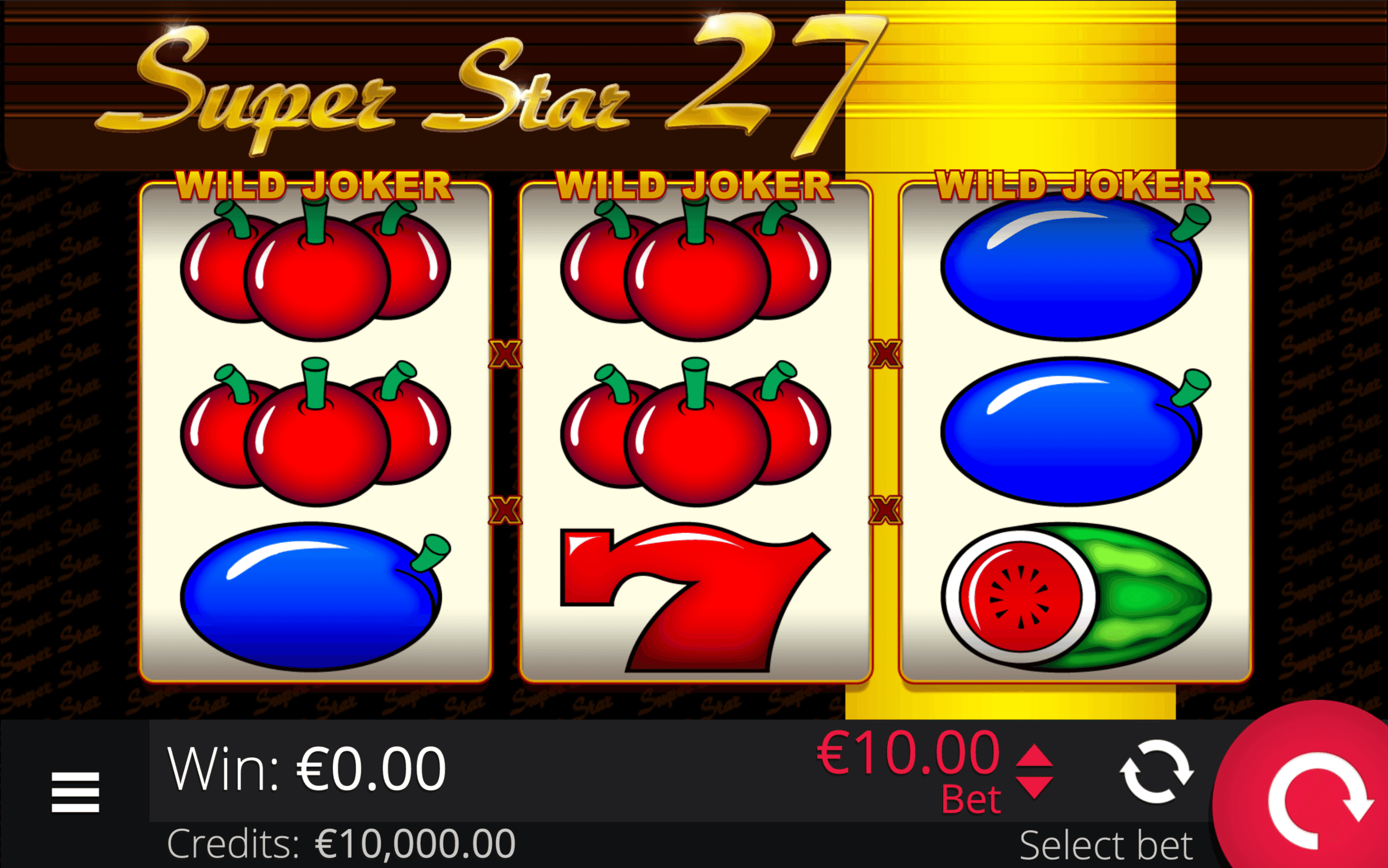 "**SUPER STAR 27** is a 3-reel, 3-row slot with 27 paylines. Joker Wild Symbols substitute for all other symbols when active and only on spins that meet the minimum required bet. Active Wilds multiply standard wins according to the number of symbols in a combination.