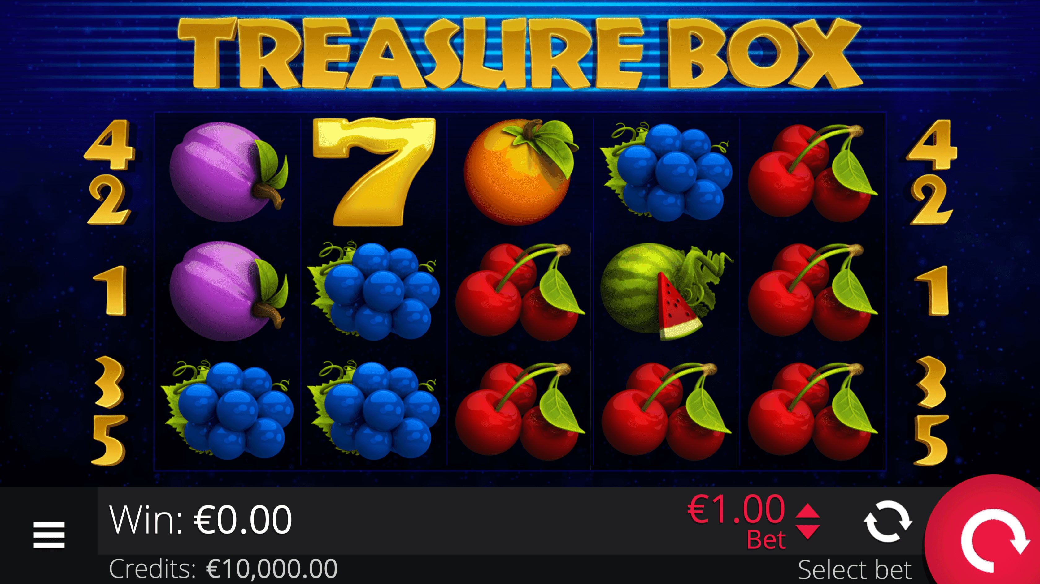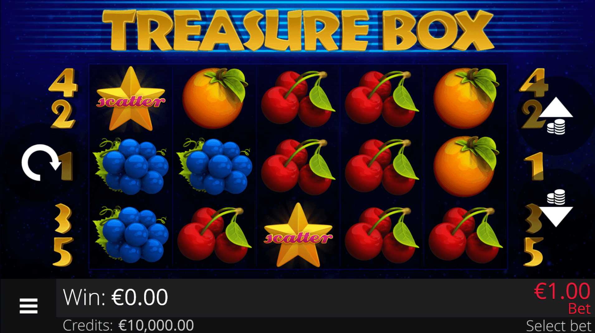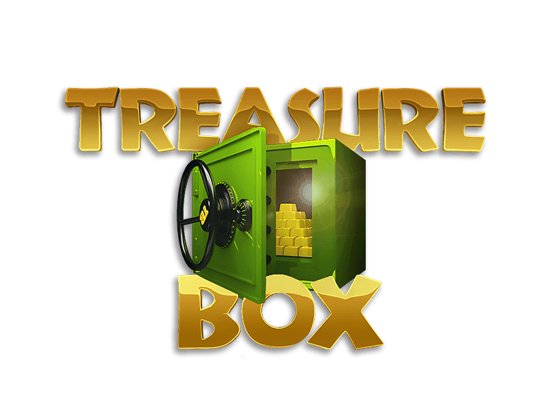 **TREASURE BOX** is a 5-reel, 3-row fruit slot with 5 paylines featuring colorful fruit symbols, Lucky sevens, the Treasure Box, and Mystery Scatters Star. Wins pay left to right from the first reel.