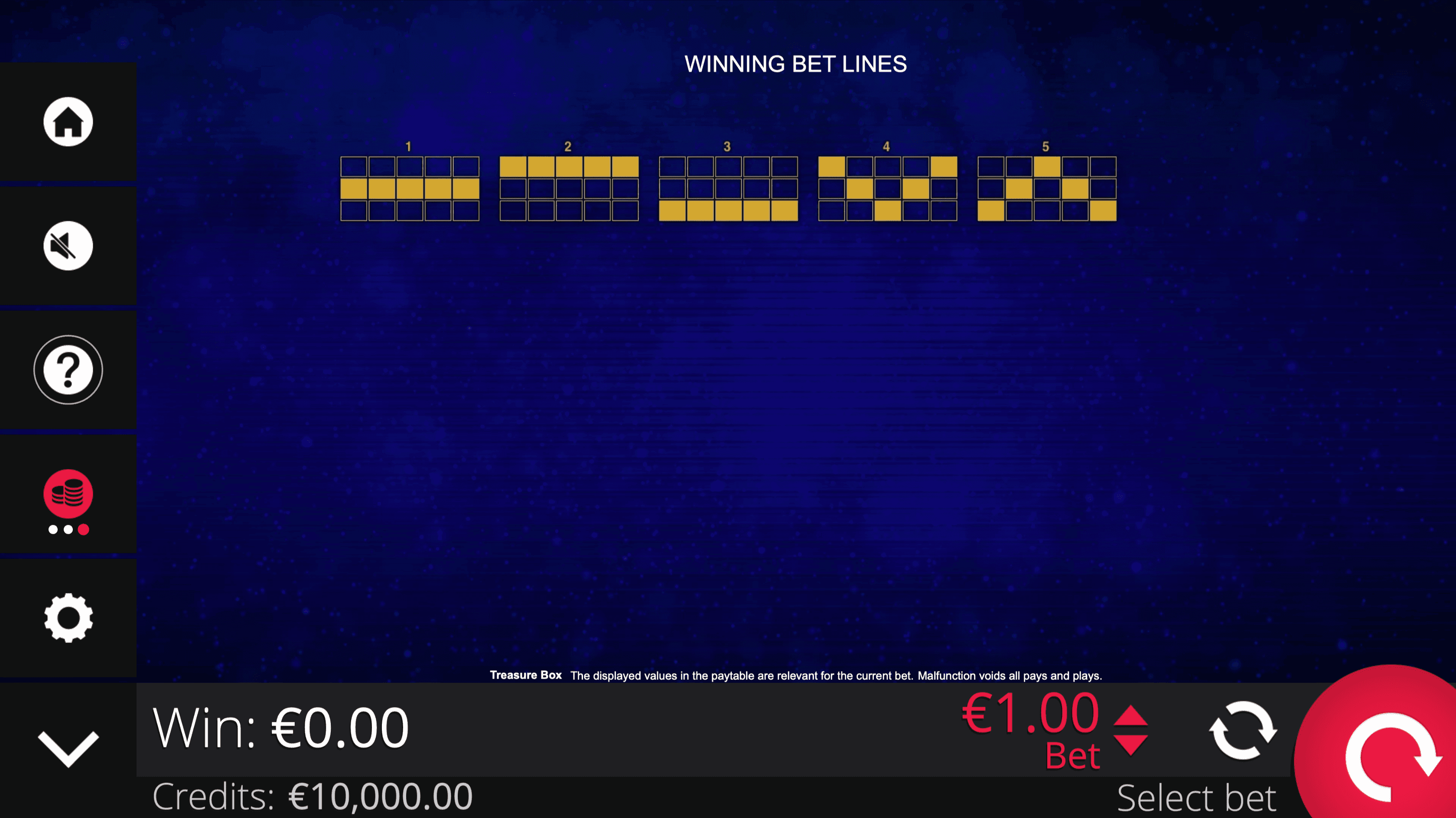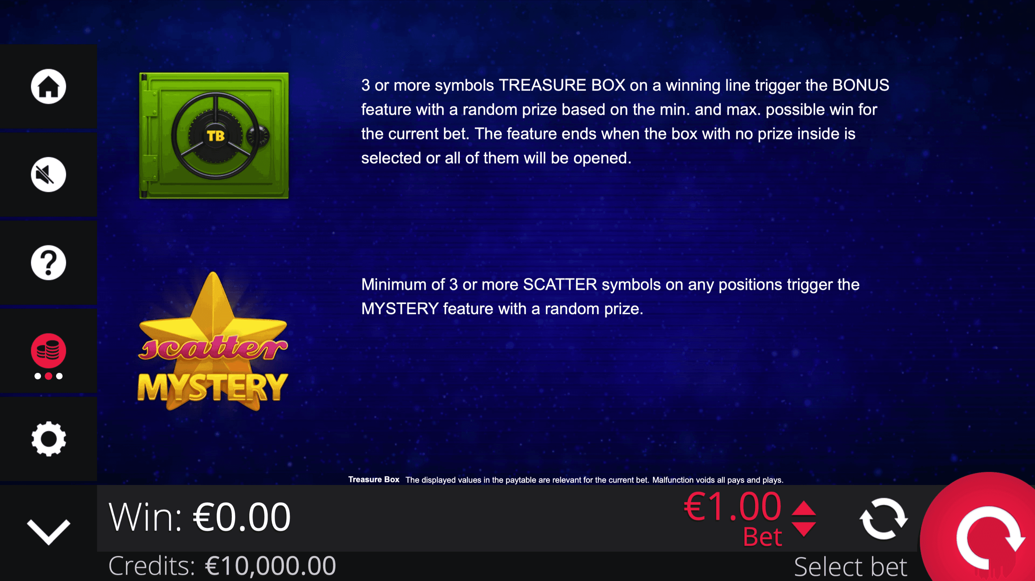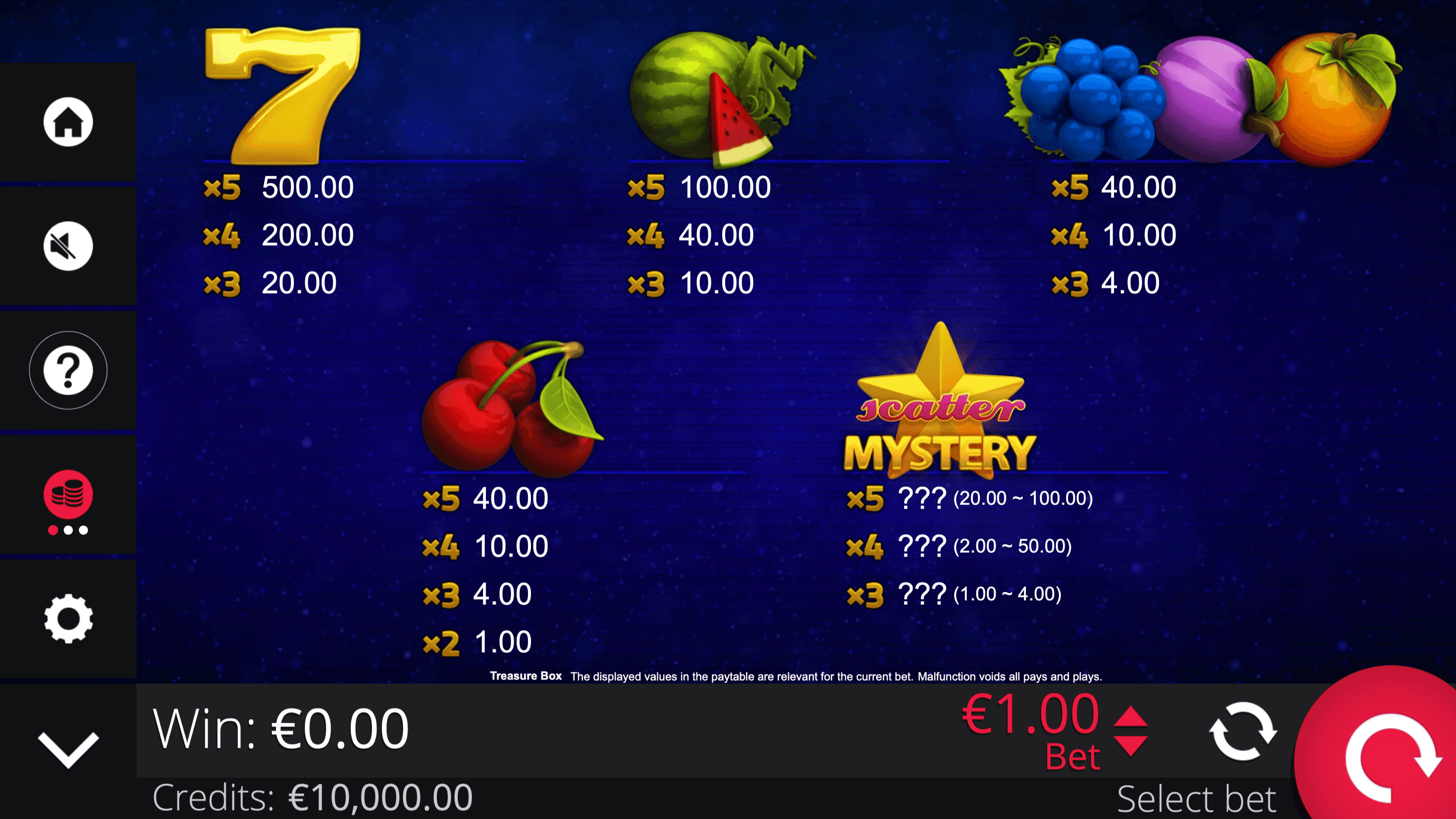 **TREASURE BOX** is a 5-reel, 3-row fruit slot with 5 paylines featuring colorful fruit symbols, Lucky sevens, the Treasure Box, and Mystery Scatters Star. Wins pay left to right from the first reel.