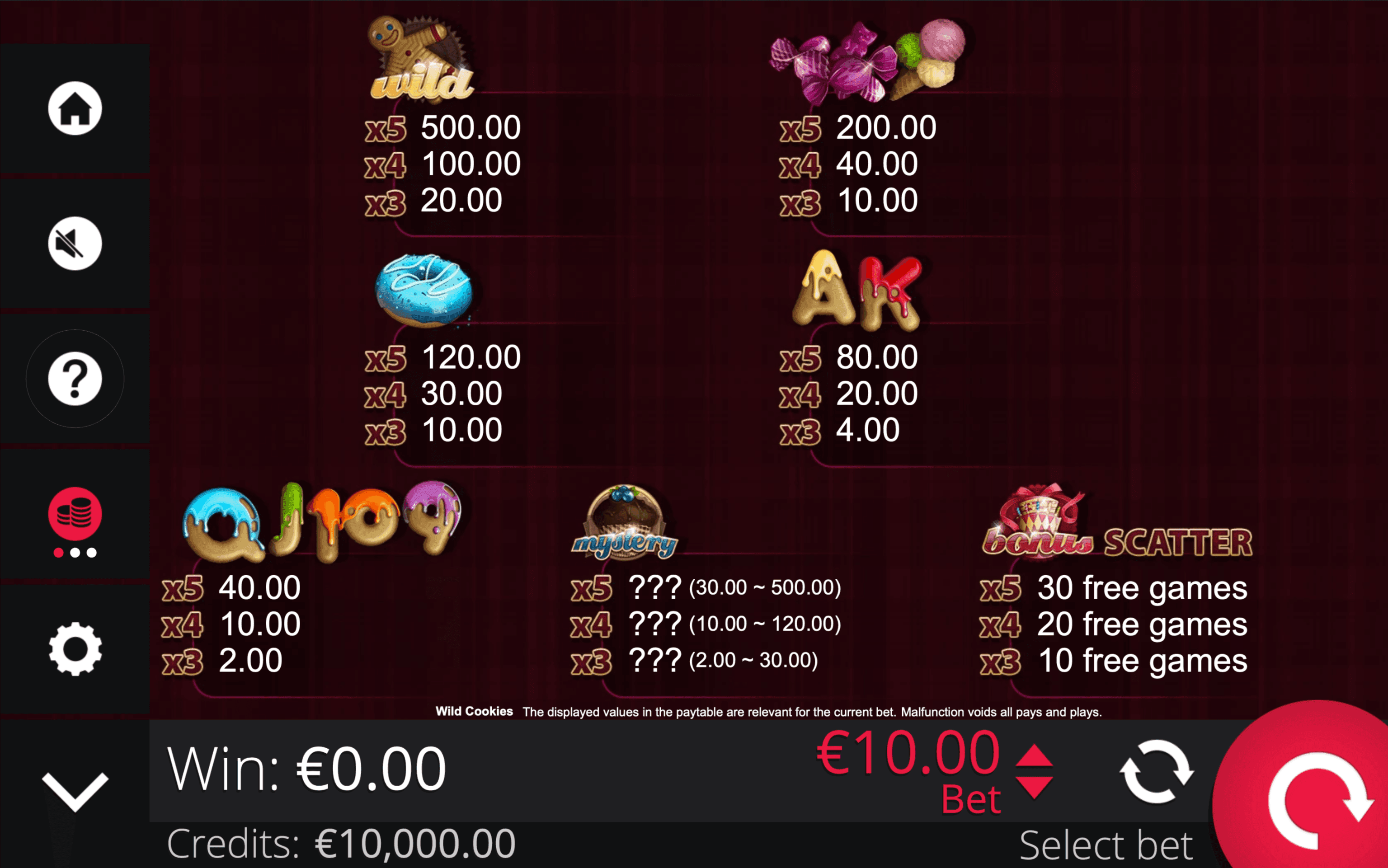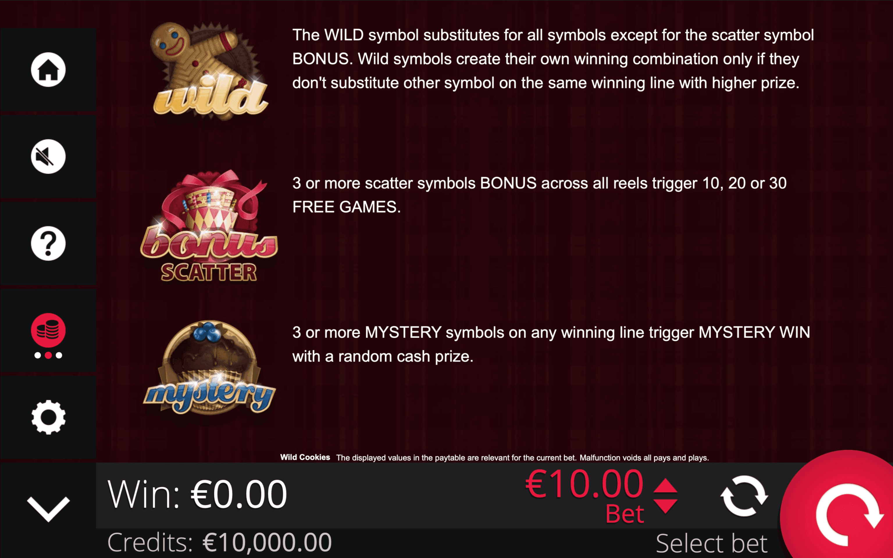 The **WILD COOKIES** slot features 12 symbols, including Wild that substitute all other symbols except the Scatter. Wild can form their own combinations if not replacing higher-paying symbols.